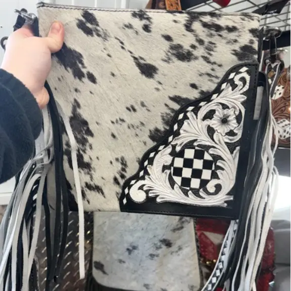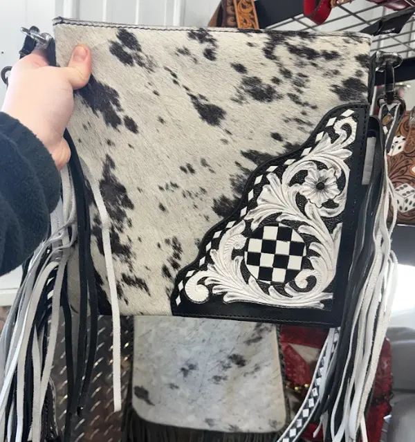 ✨ Discover the Genuine cowhide and hand tooled/painted leather crossbody bag. This unique piece features a checkered fringe design that adds a touch of flair. The tooled strap complements the overall aesthetic, making it a standout accessory. Perfect for those who appreciate artisanal craftsmanship.