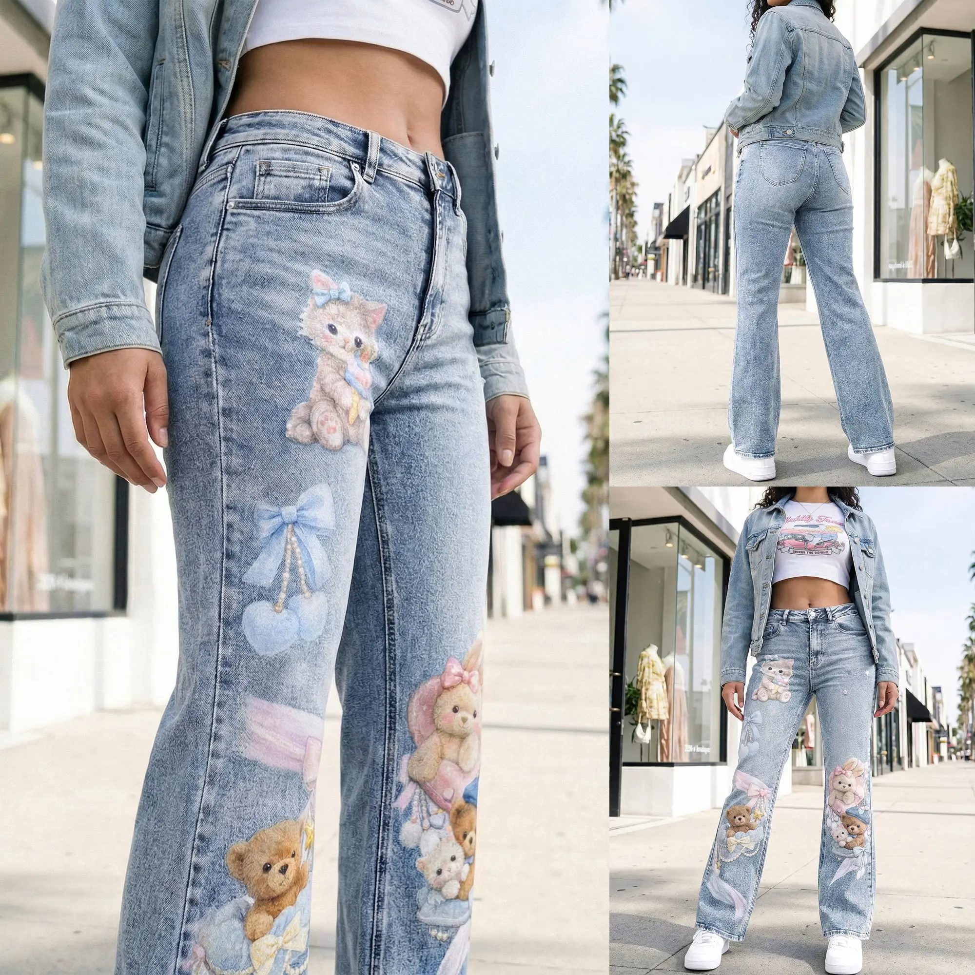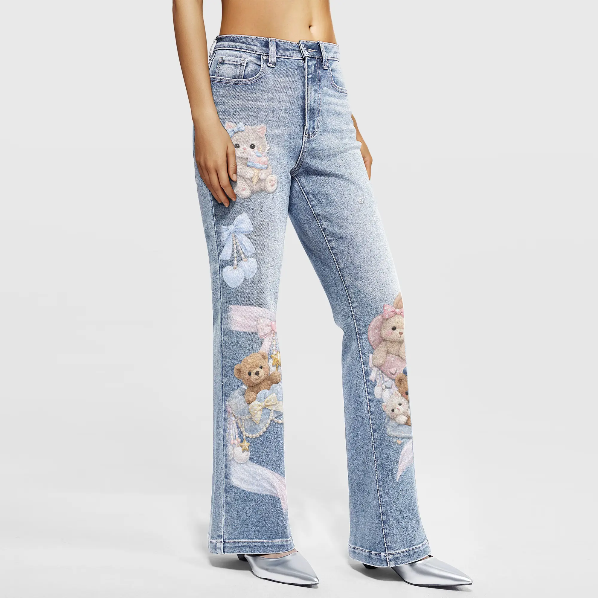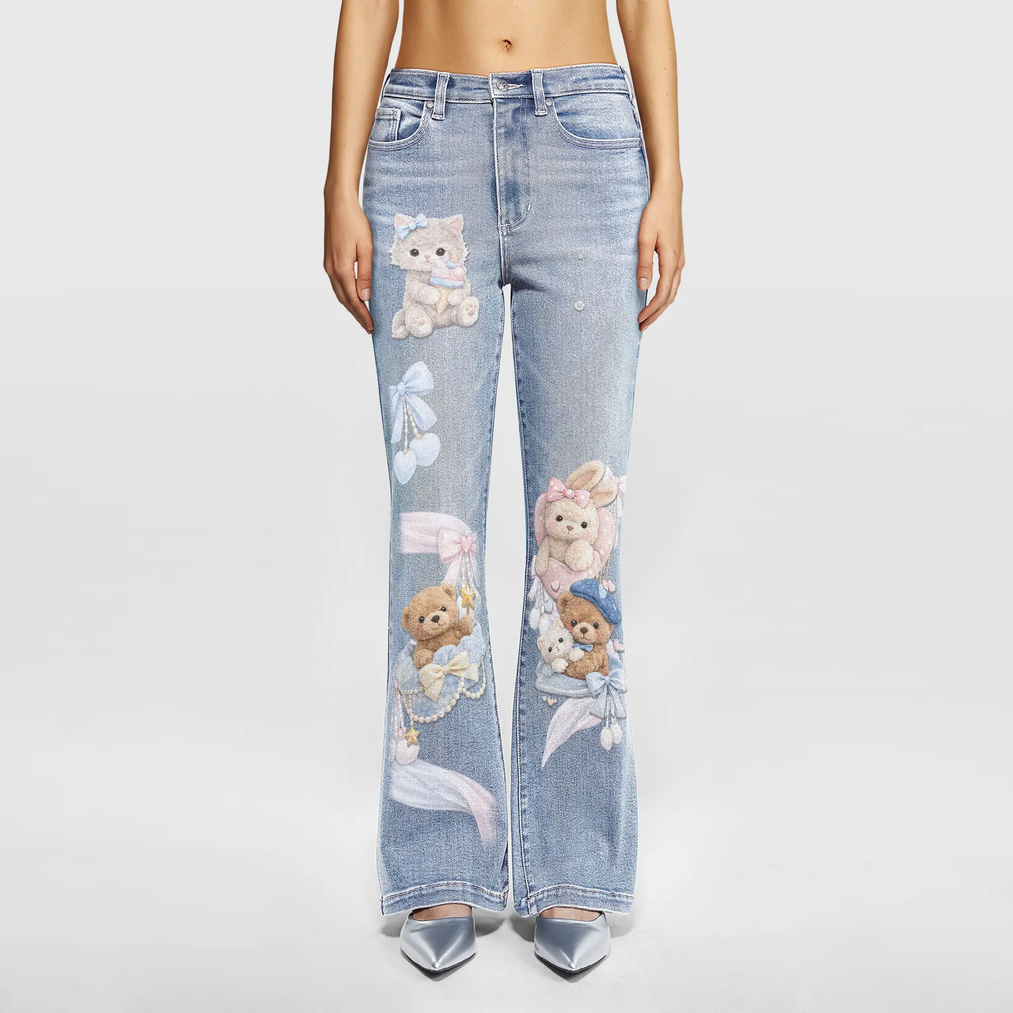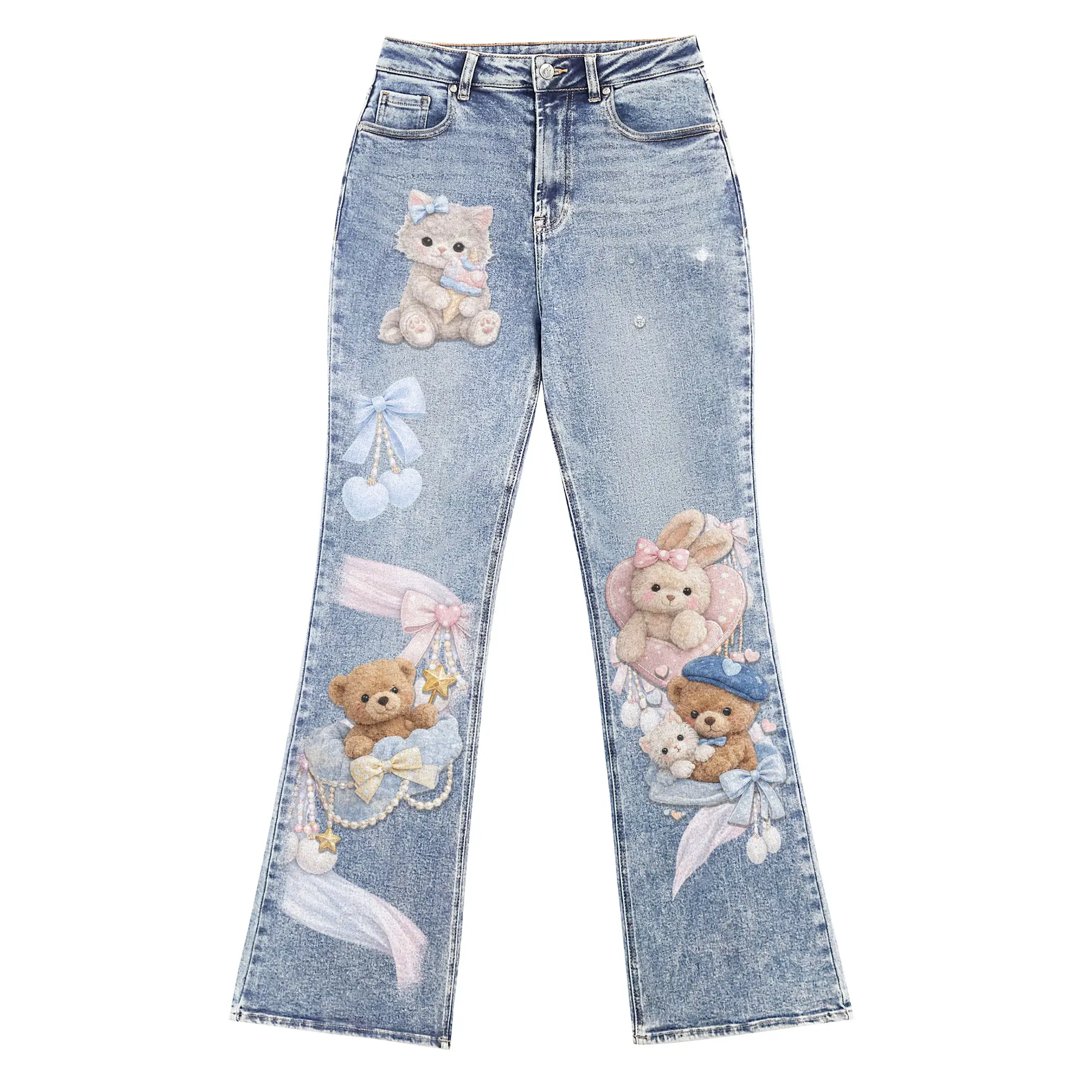 These light-wash denim jeans feature adorable kawaii bear and bow prints for a cute yet trendy streetwear look. Designed with a flattering high-waist and slight flare leg, they enhance your silhouette while staying comfortable. Made from soft, stretchy denim, perfect for everyday wear, Y2K style, or statement outfits.