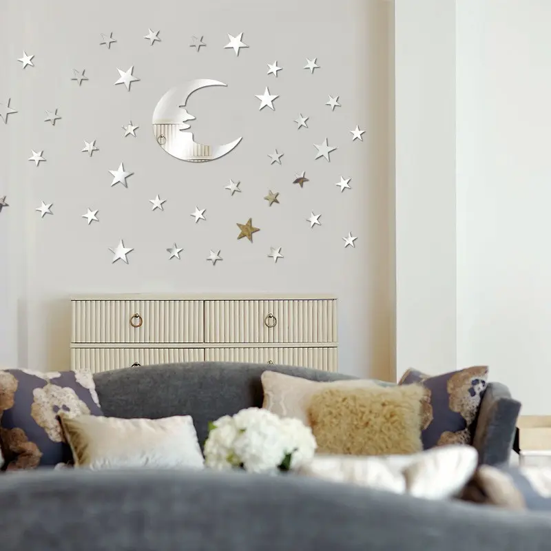 Moon & Stars Acrylic Mirror Wall Stickers, 3D Self-Adhesive DIY Celestial Mirror Wall Decals, Modern Nordic Style Shatterproof Wall Art Decor for Kids Room Bedroom Nursery, Make Room Look Bigger, Easy Install