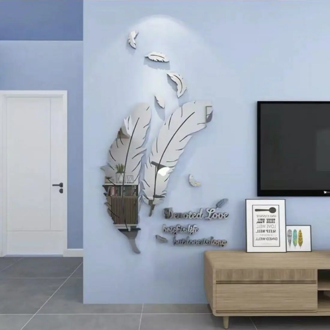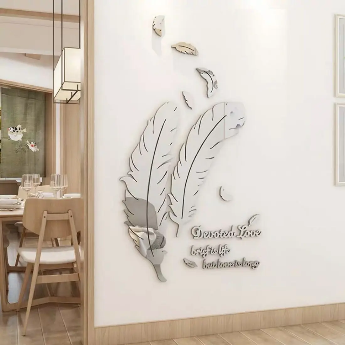 Feather Acrylic Mirror Wall Stickers, 3D Self-Adhesive DIY Feather Mirror Wall Decals, Modern Minimalist Nordic Style Shatterproof Wall Art Decor with Love Quote for Living Room Bedroom Entryway, Make Room Look Bigger, Easy Install