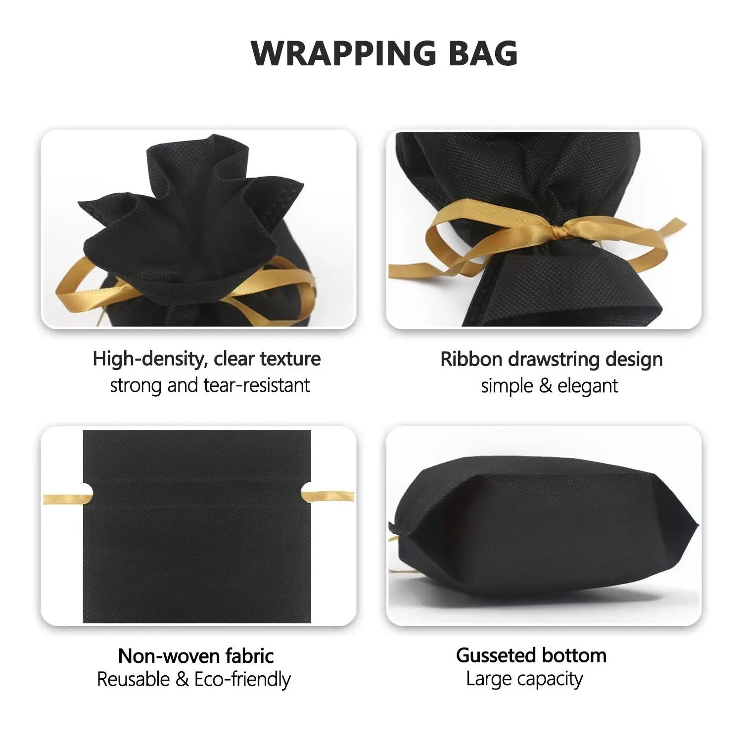 Wrapping bag: Made of durable non-woven fabric with a soft, light weight outer layer for a gentle touch. The ribbon drawstring adds a touch of elegance while providing easy closure.