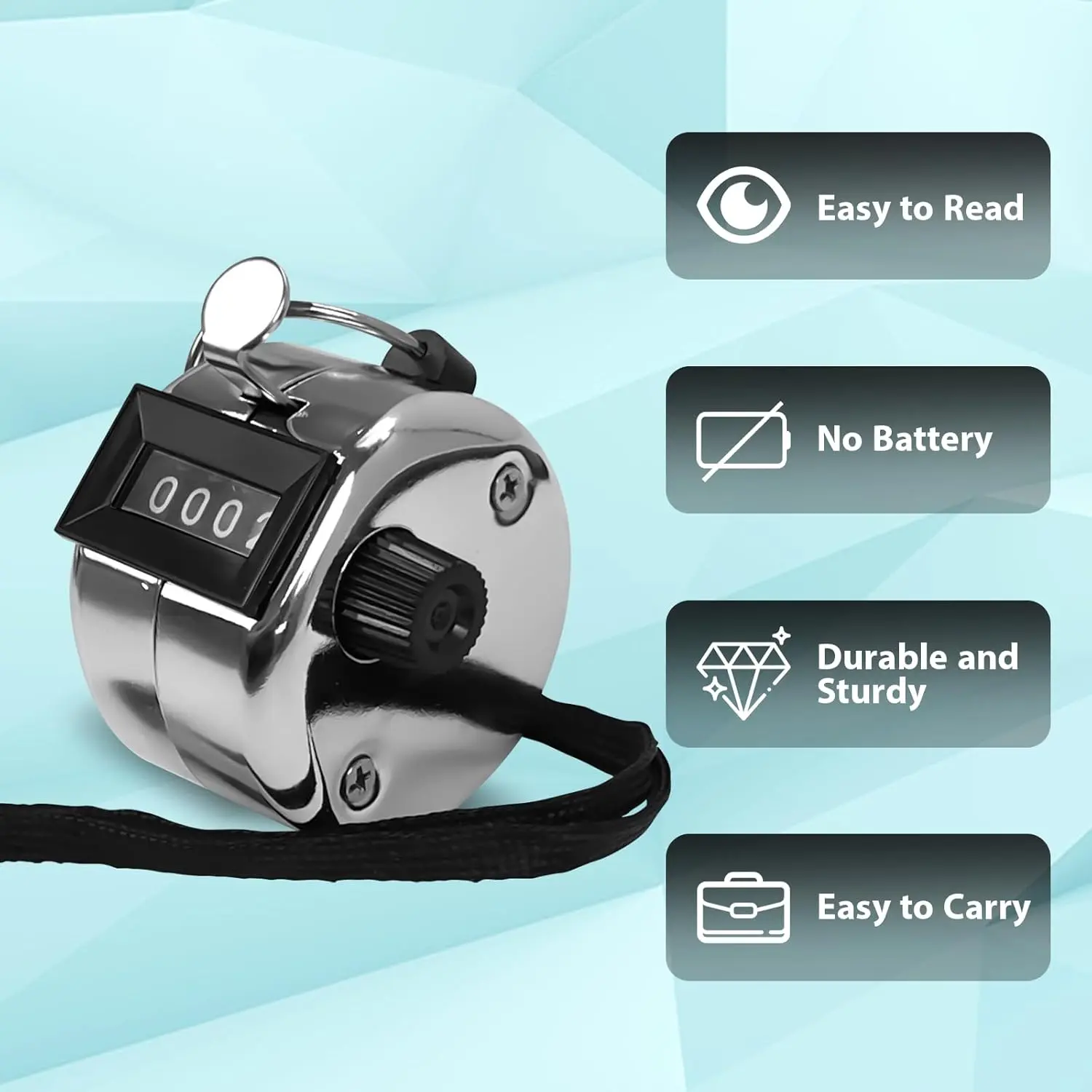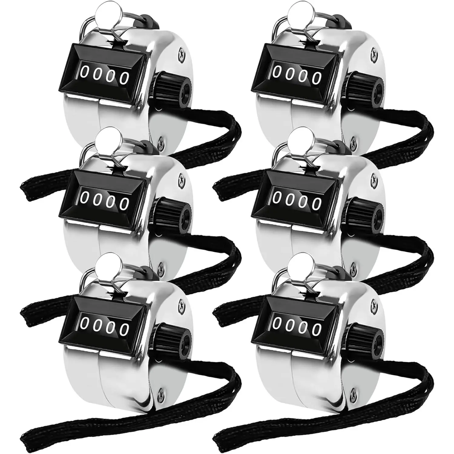 POXXU 6 Pack Clicker Counter is a practical and user-friendly device.With a 4-digit display that can tally up to 9999 counts and an easy reset function by simply turning the reset knob clockwise, it operates on a mechanical structure without the need for batteries, ensuring accurate and reliable use.Its durable case, sturdy finger ring and included black nylon lanyard make it robust and versatile for various carrying ways.