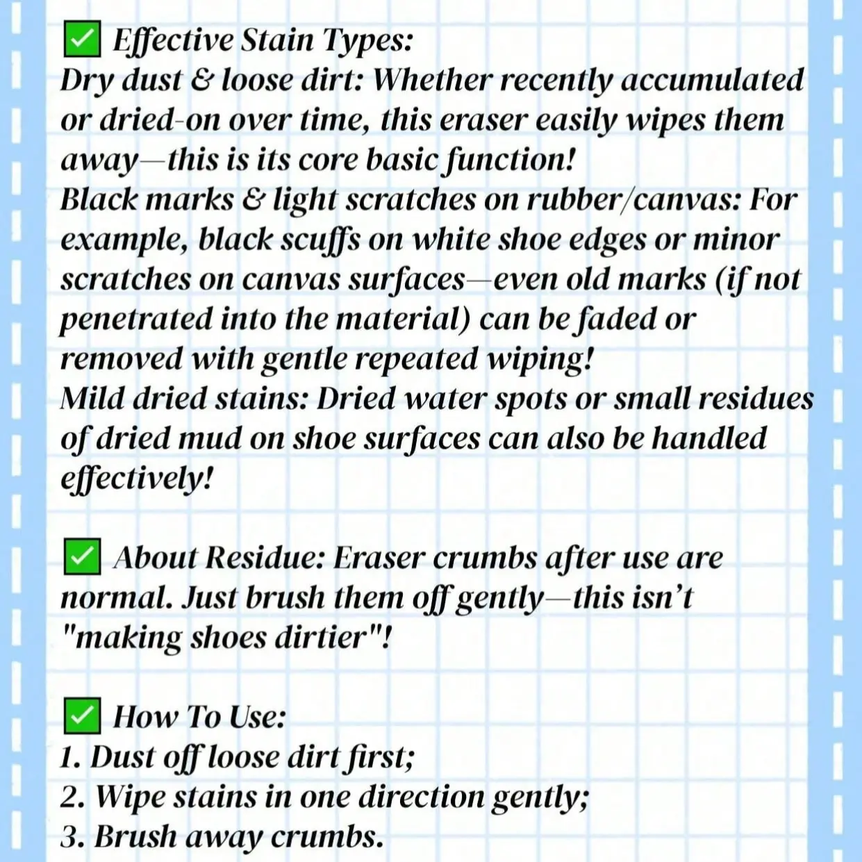 【Dry Cleaning】: Removes stains effortlessly without wetting, keeping your shoes clean and fresh.