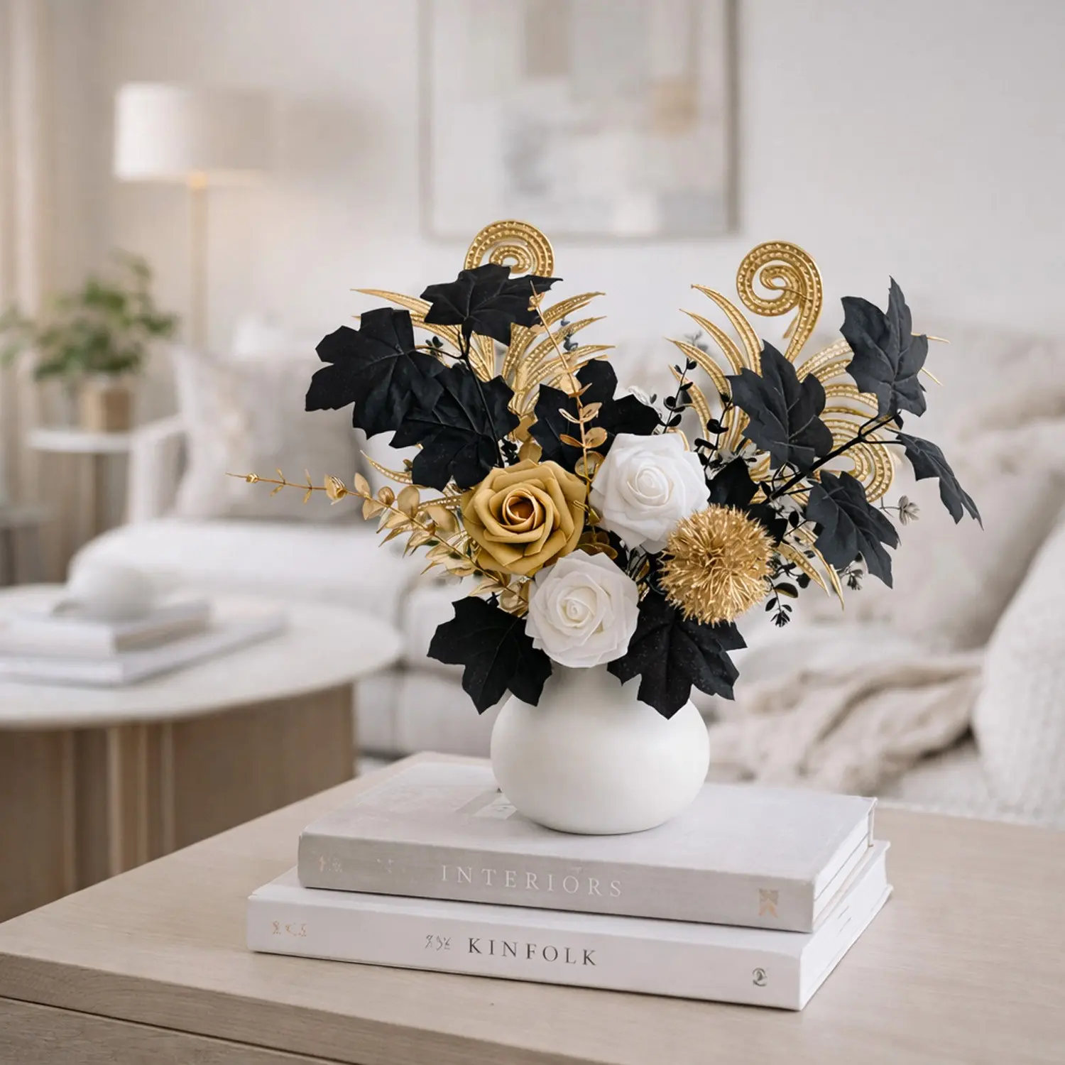 【Unique Combination】: Features black maple leaves, gold roses, white roses, and eucalyptus leaves for a striking look.