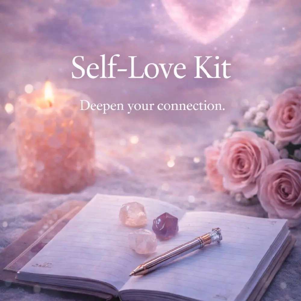 This kit includes a curated selection of physical items designed to support your daily self-care routine, including crystals, journaling tools, and complementary elements.