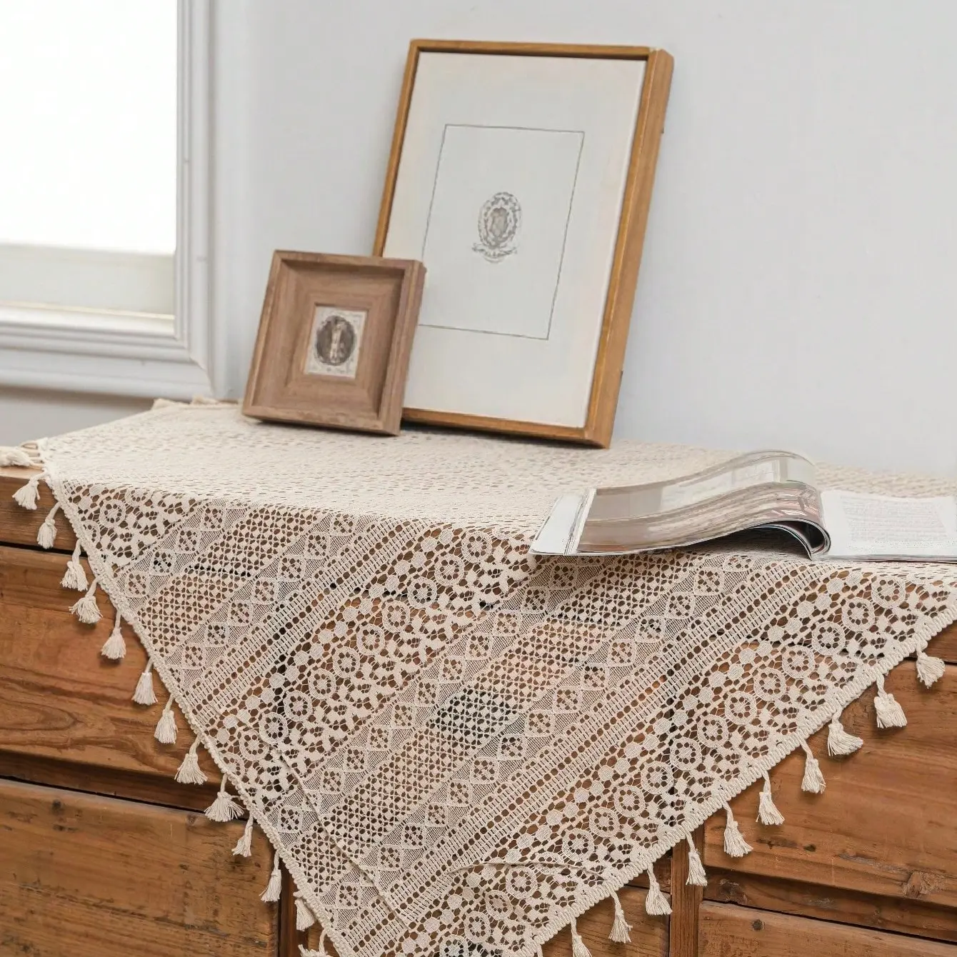 1pc Geometric Lace Tablecloth with Fringe, Square Cutout Design, Ideal for Cabinets, Dining Tables, and Tea Tables