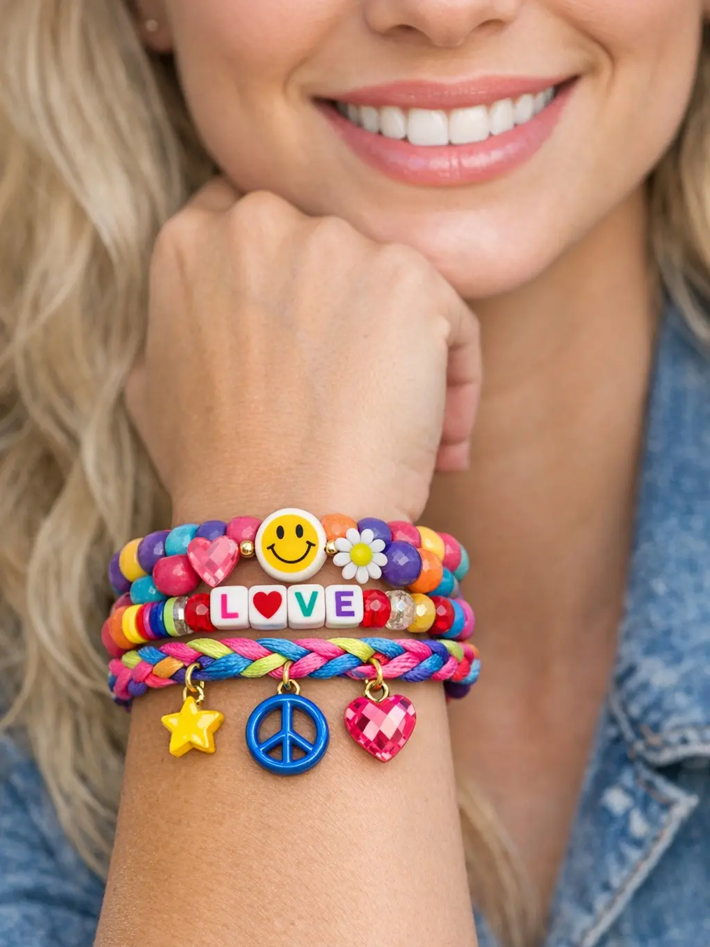 Each stack includes a variety of bracelet styles and colors. Not all bracelets are the same, ensuring a unique and vibrant look. These bracelet stacks make great gifts, party favors, or fun accessories to collect. Add a splash of color to any occasion with our Sass Stack.