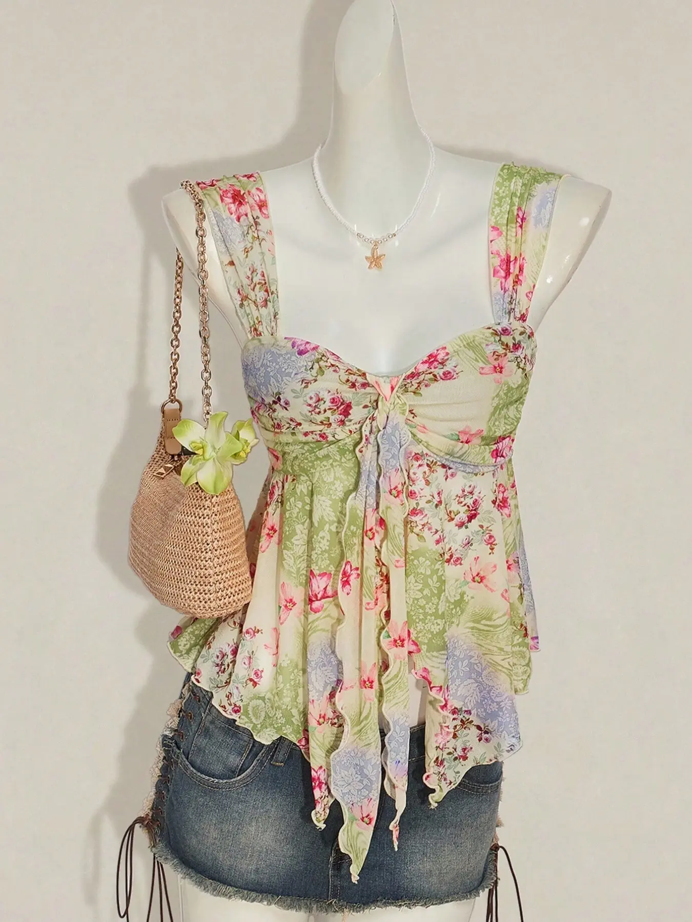 5. Summer Beach Vacation Floral Mesh Halter Top, Cute Asymmetrical Hem Sleeveless Women's Transparent Shirt, Small Fresh Style