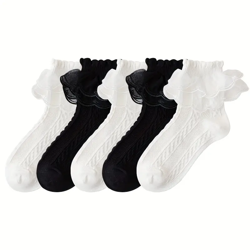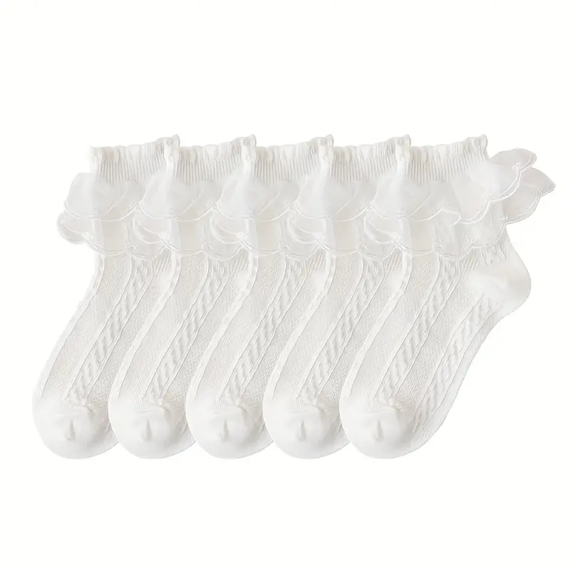 5. (New)New[Breathable Lace Socks] 5 Pairs Breathable Girls' Lace Ruffle Socks | Polyester Blend, Comfortable, All-Season White Princess Socks for Dancing, Hand Wash Only, Dancing Socks | Ruffle Detail Socks | Knit T