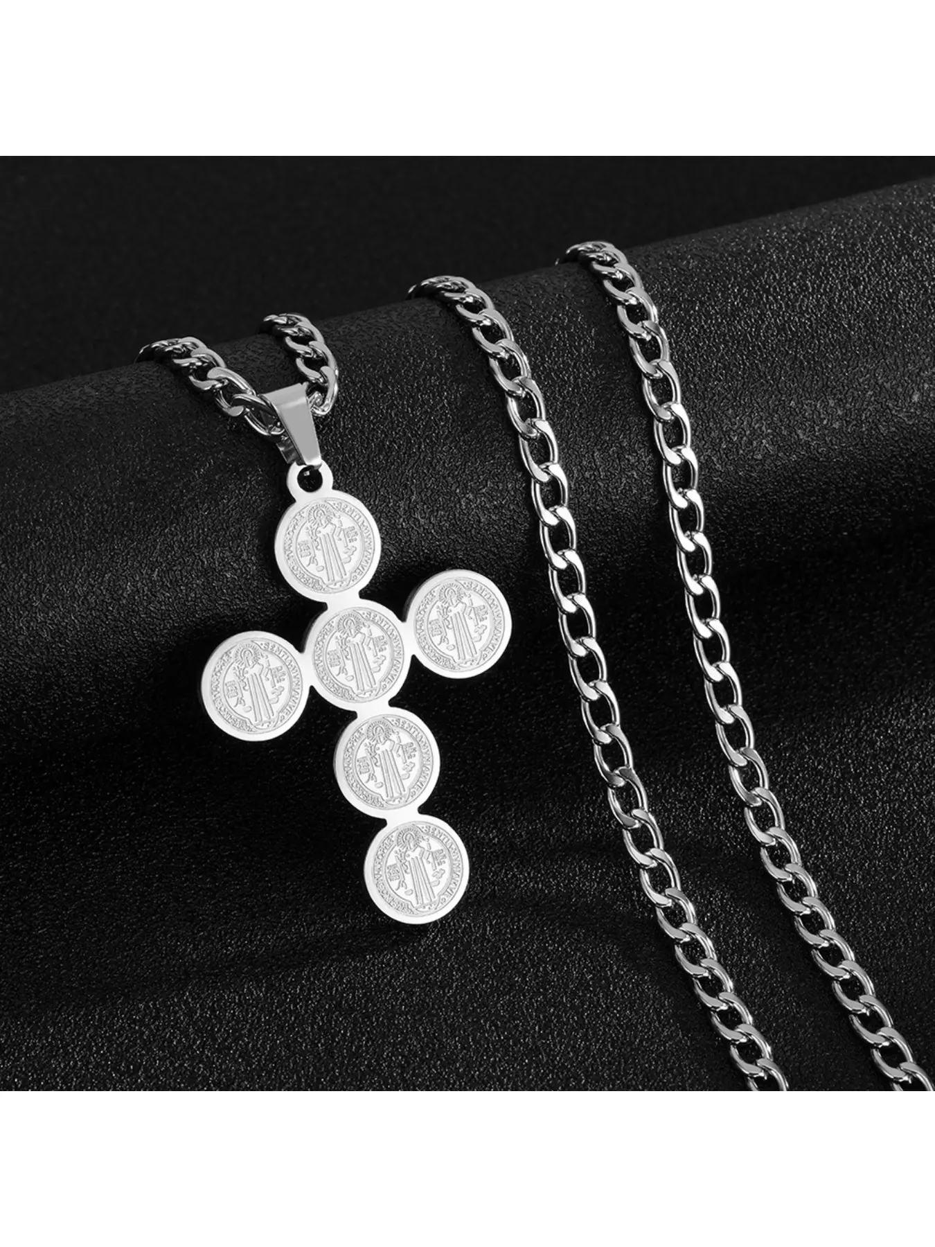 Vintage Cross Engraved Coin Pendant Necklace, Grunge Streetwear Titanium Steel Chain, Non-Tarnish Edgy Jewelry