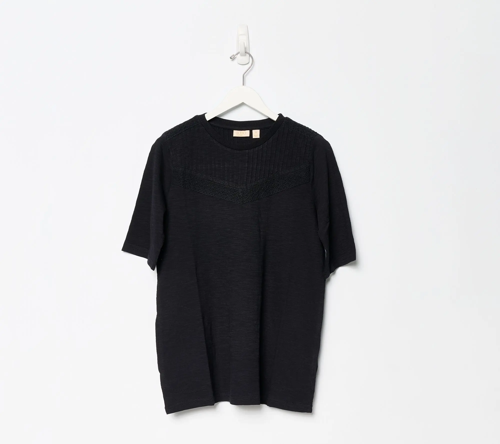 ·Features: crew neck, elbow-length sleeves, pintuck yoke at front, lace details, side pocket