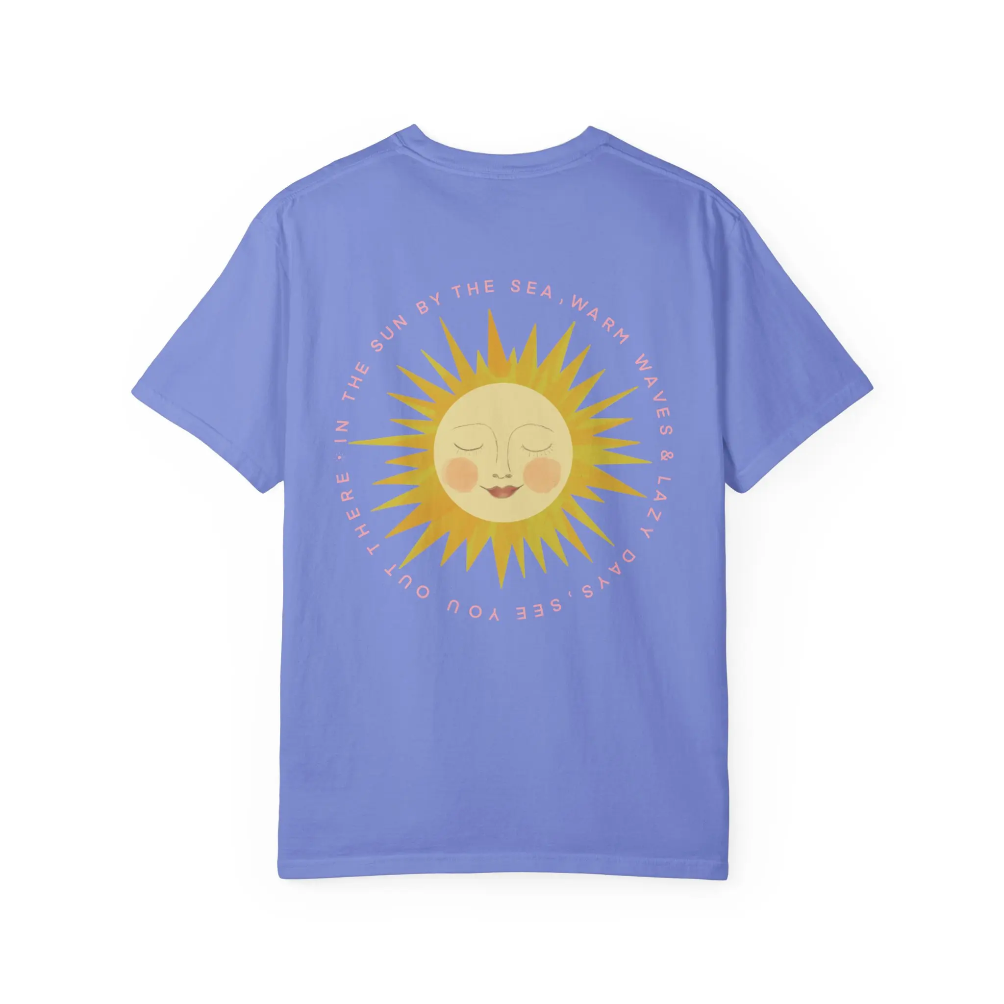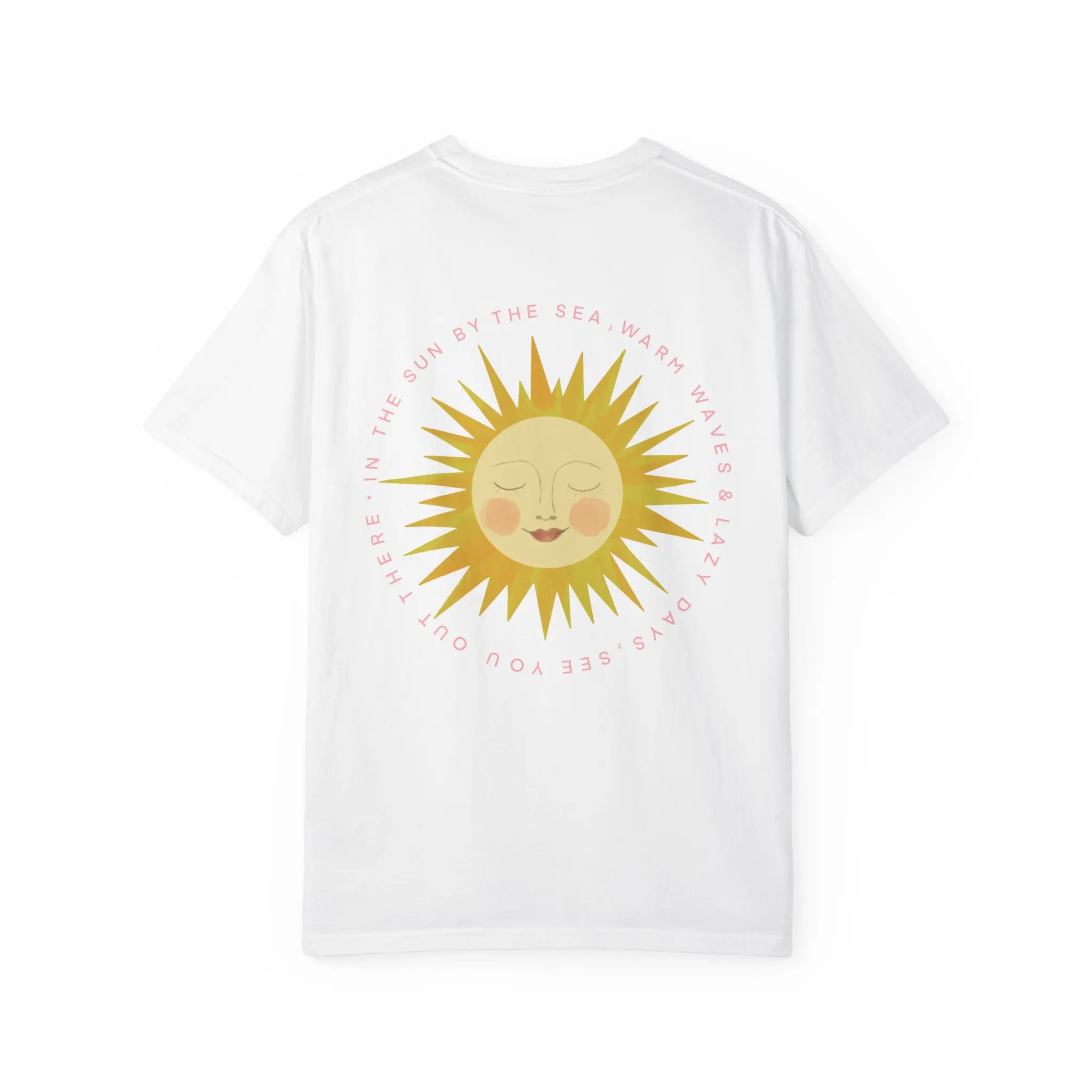 A soft, garment-dyed tee that feels lived-in from the first wear. A warm, hand-drawn sun rests over the heart and blooms larger across the back, its gentle face and rosy cheeks catching the light like a memory of summer mornings. Lightweight but sturdy, the relaxed silhouette drapes easily over layers or stands alone on warm days. Wear it to stroll salt air beaches, sketch under a cafe awning, or fold into a weekend bag for spontaneous escapes — it’s a quiet, sunny presence that ages beautifully with every wash and adventure.