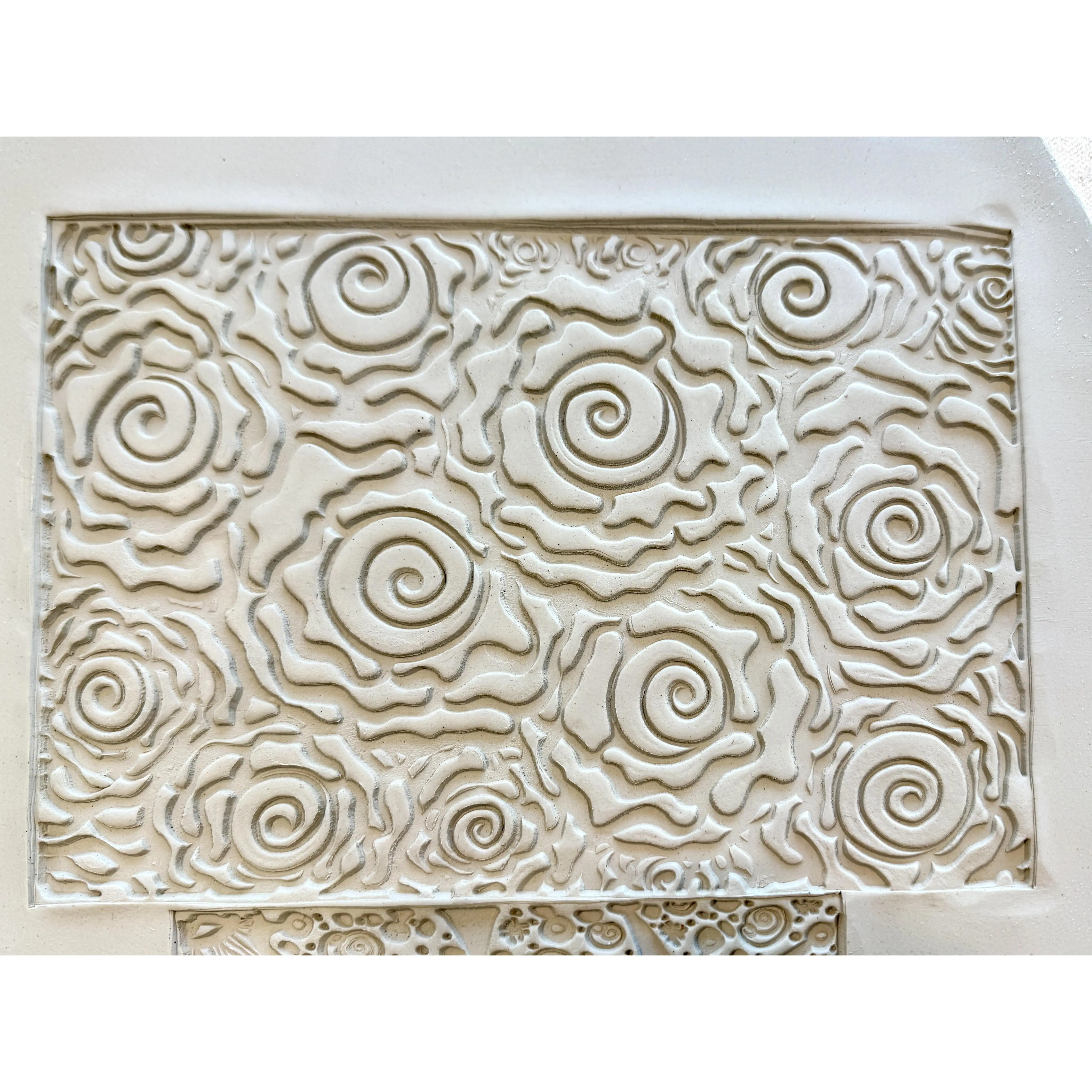 This is a handmade, hand drawn design, size choices are 6x9" rectangle, reusable rubber texture sheet for making impressions in clay. There is no backer and the flexible rubber allows for crisp and deep imprints on the clay for bold designs.
