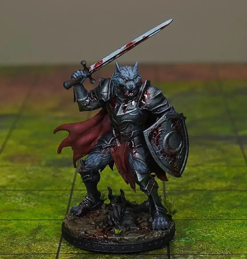 • 1 Detailed Werewolf Knight Miniature: A single, high-quality resin print featuring a snarling lupine head, ornate heavy plate armor over chainmail, a massive greatsword, and a shield emblazoned with a crescent moon.