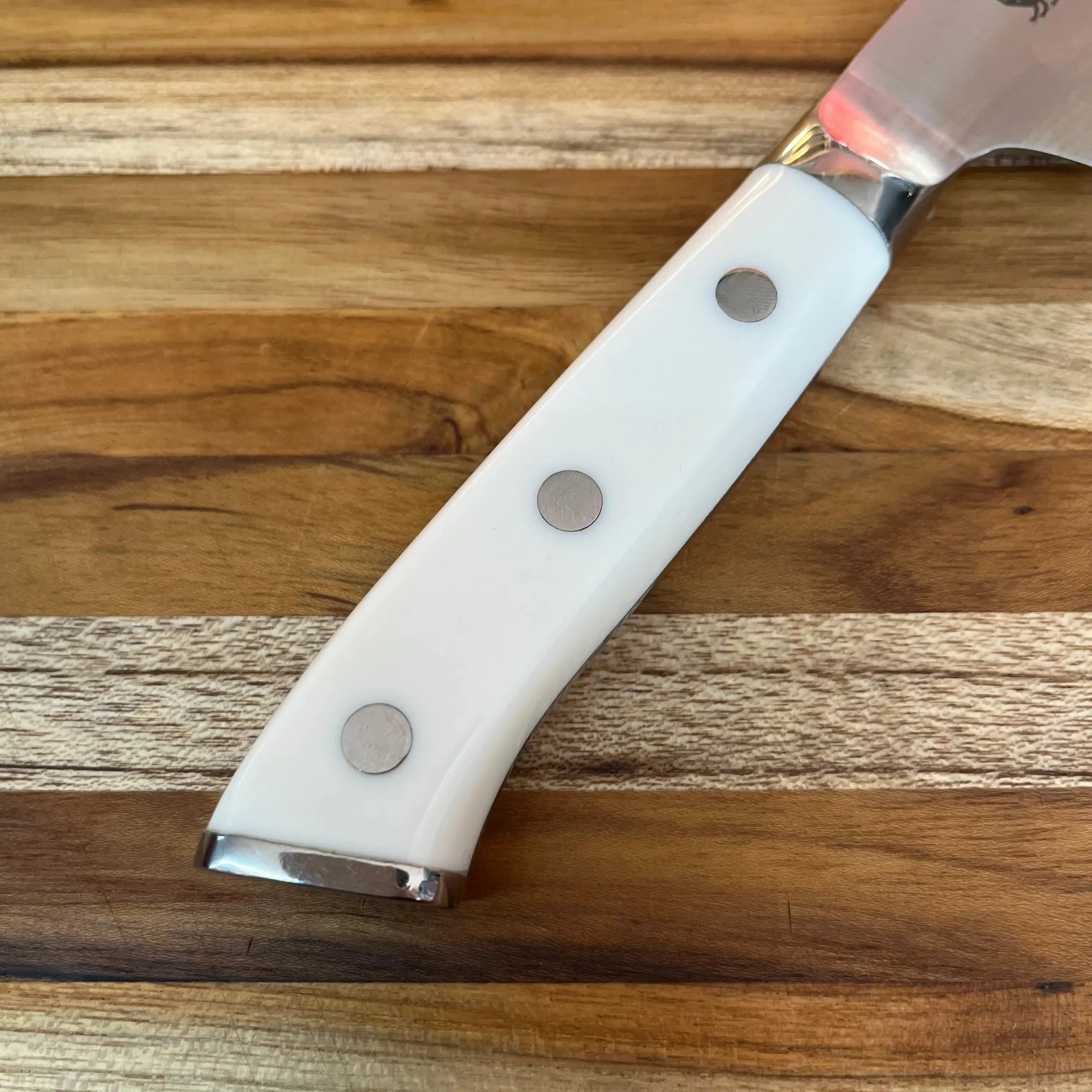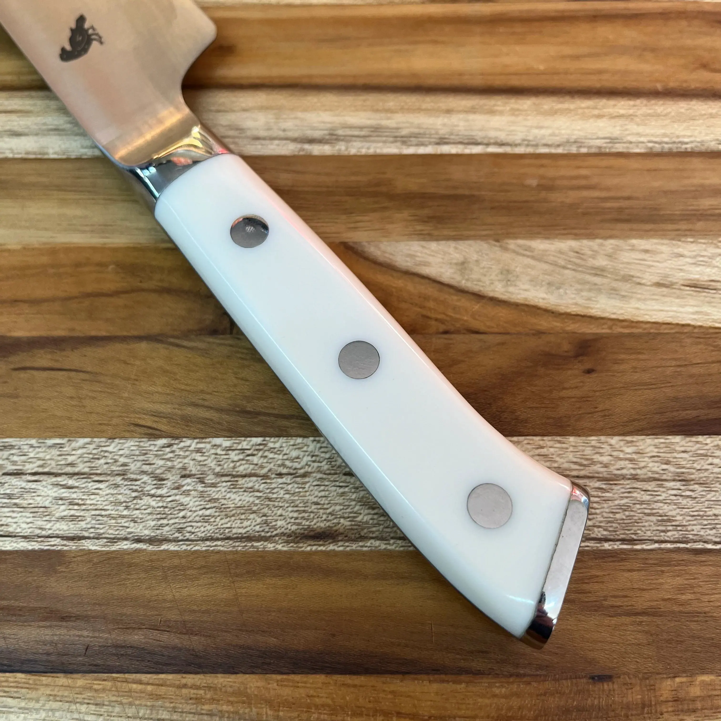 In short, the Perfect Edge Shiro Hane 10" Slicing Knife delivers clean, consistent slices with less effort, featuring American CTS-BD1N nitrogen-infused steel, HRC 63 hardness, a 50:50 double bevel, and a durable white Corian handle that’s easy to clean and stain resistant.