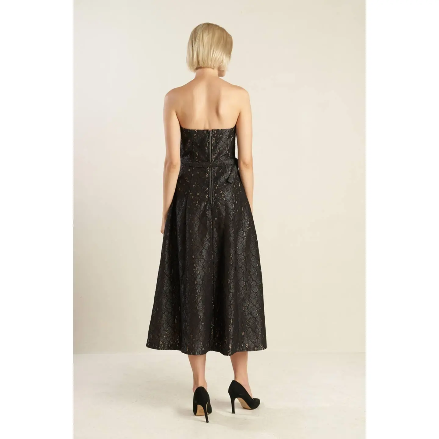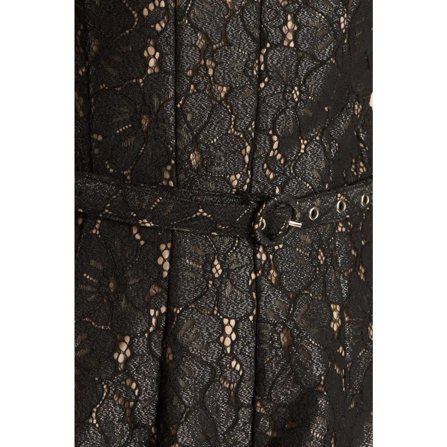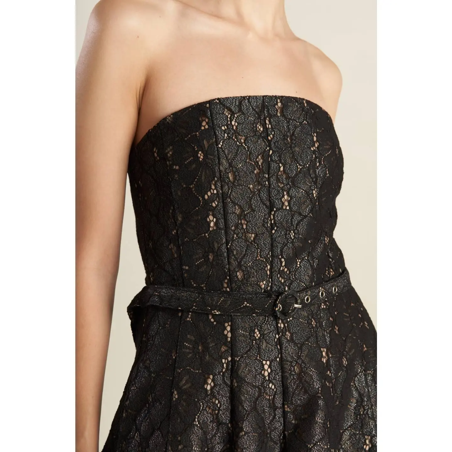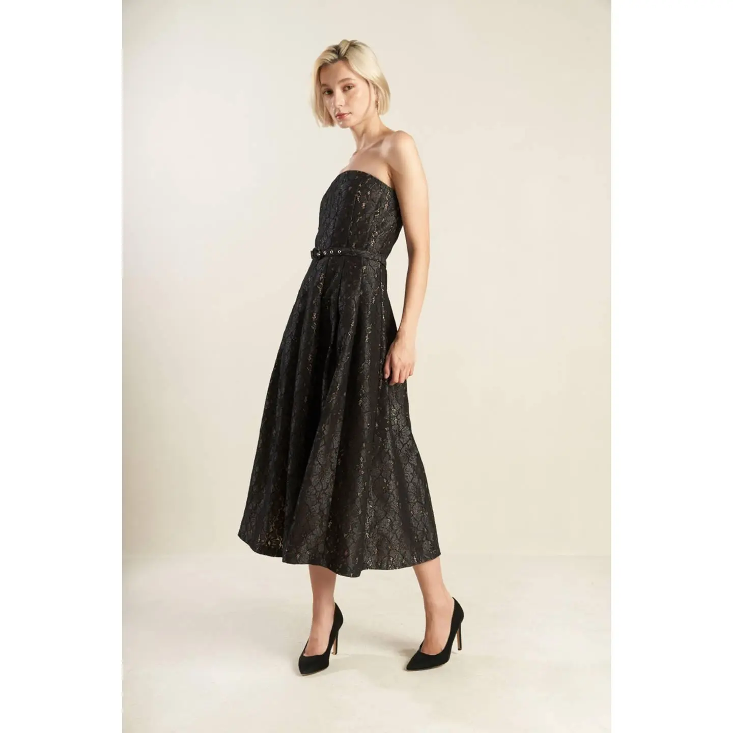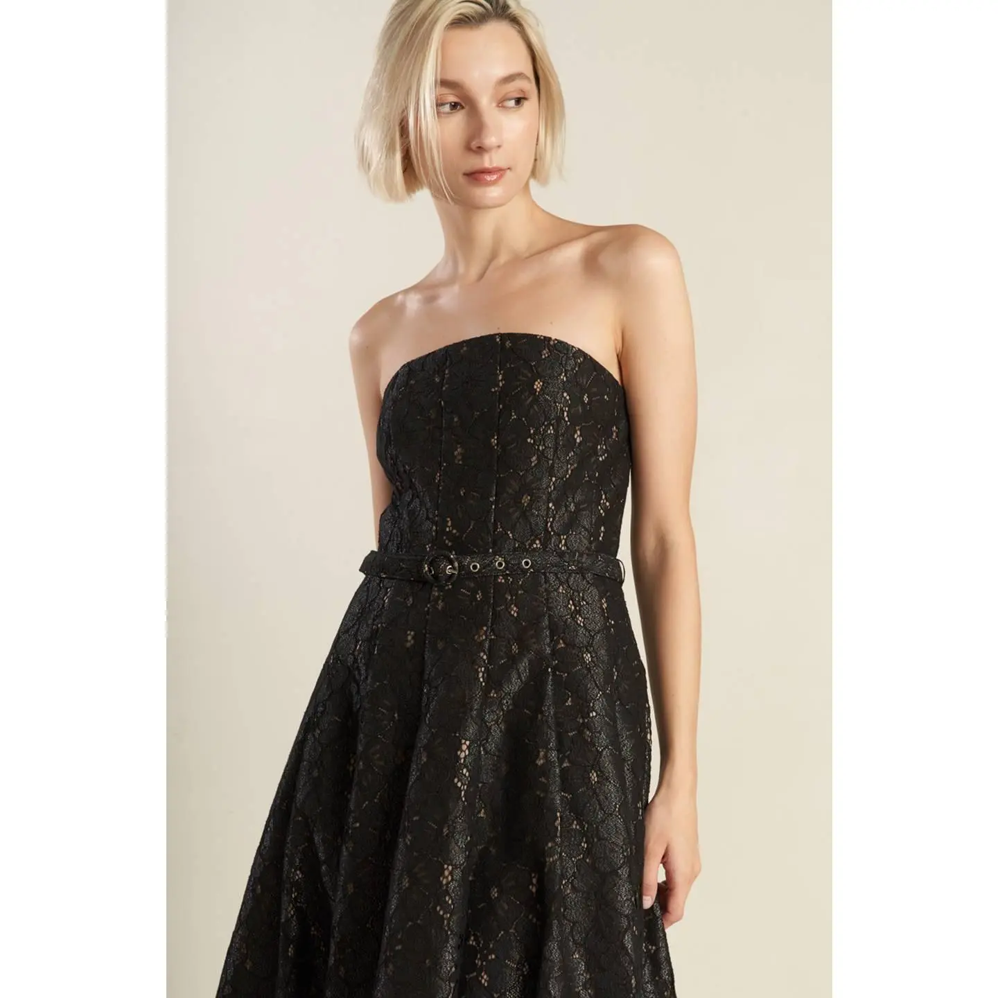 A woven lace midi dress featuring straight neckline, self sash tie and back zipper closure