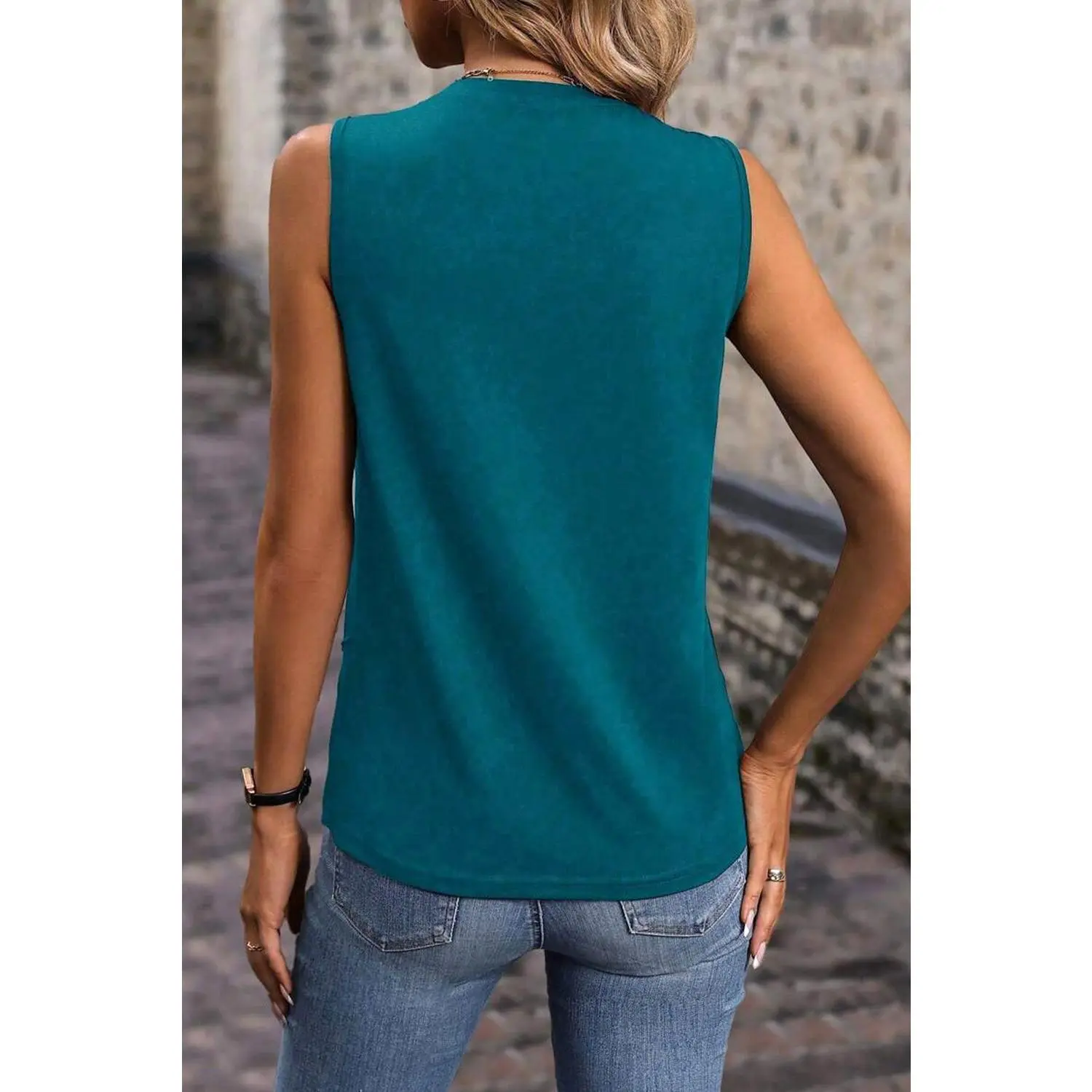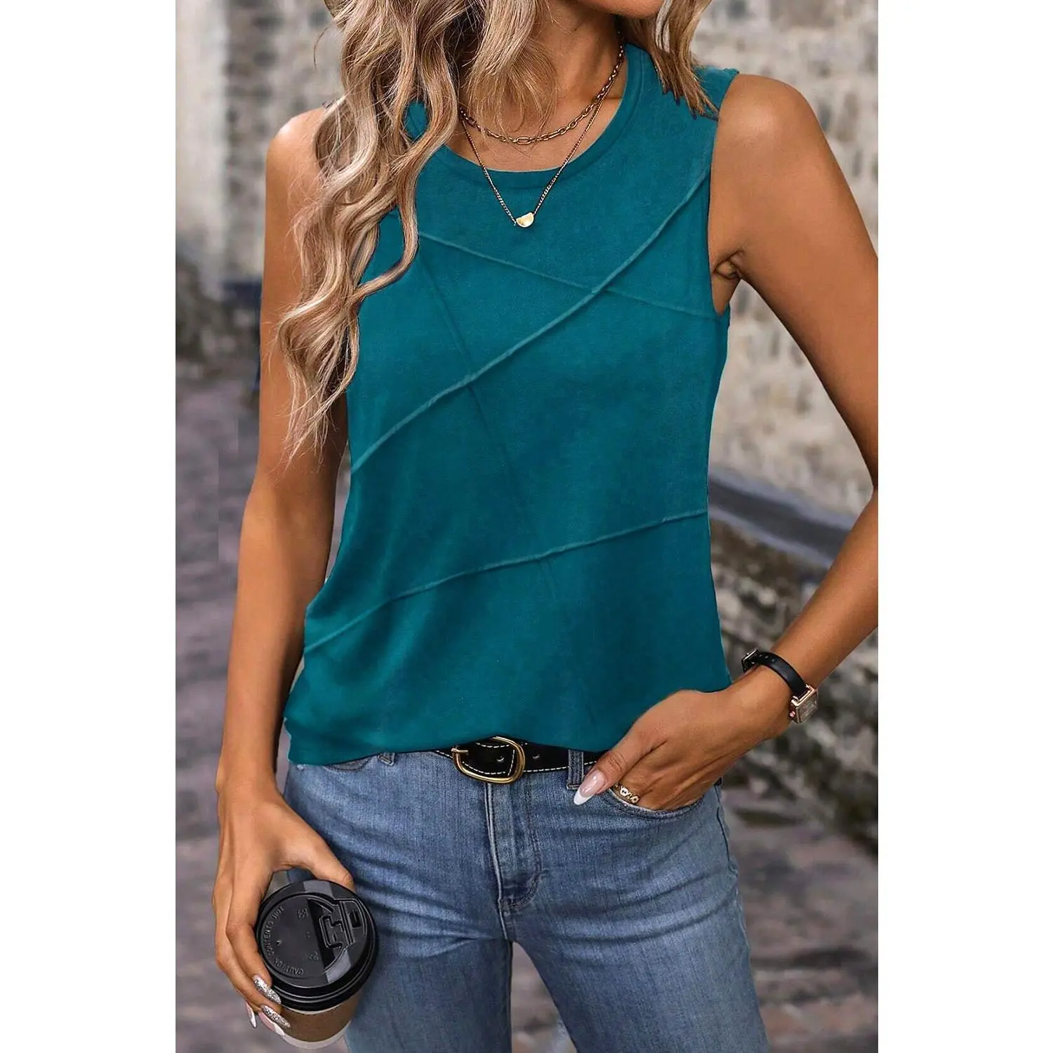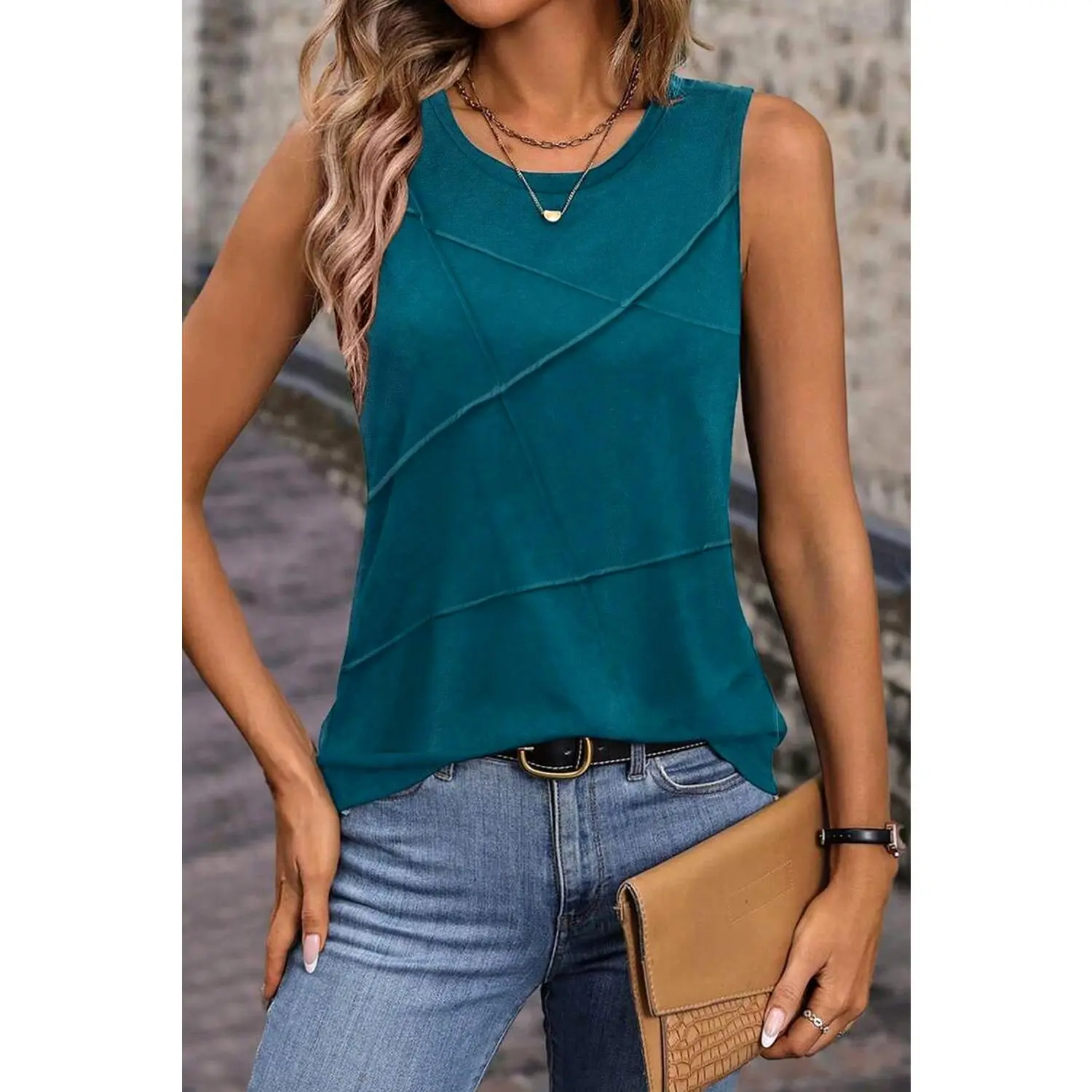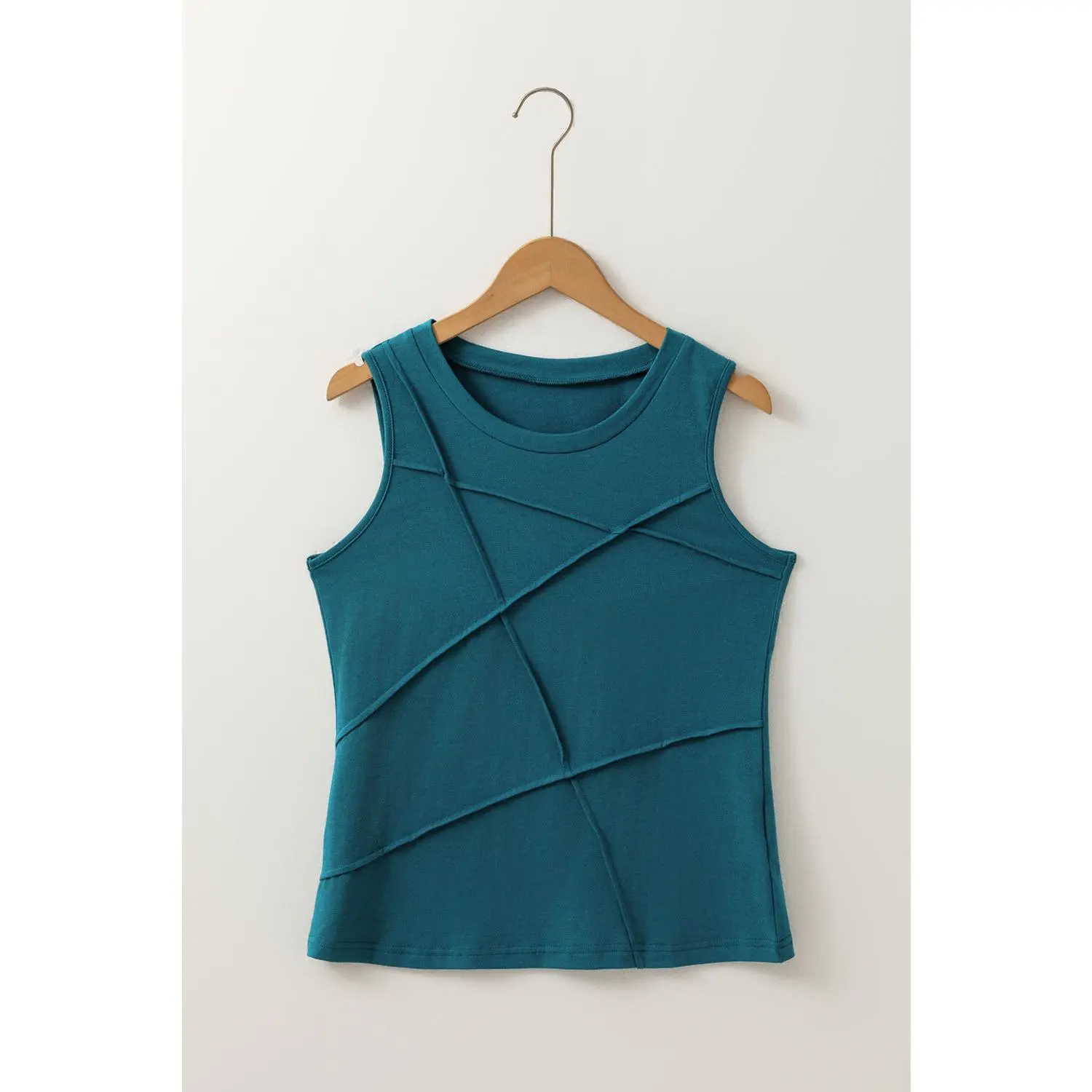Blue Sapphire Solid Color Stitching Detail Round Neck Tank Top