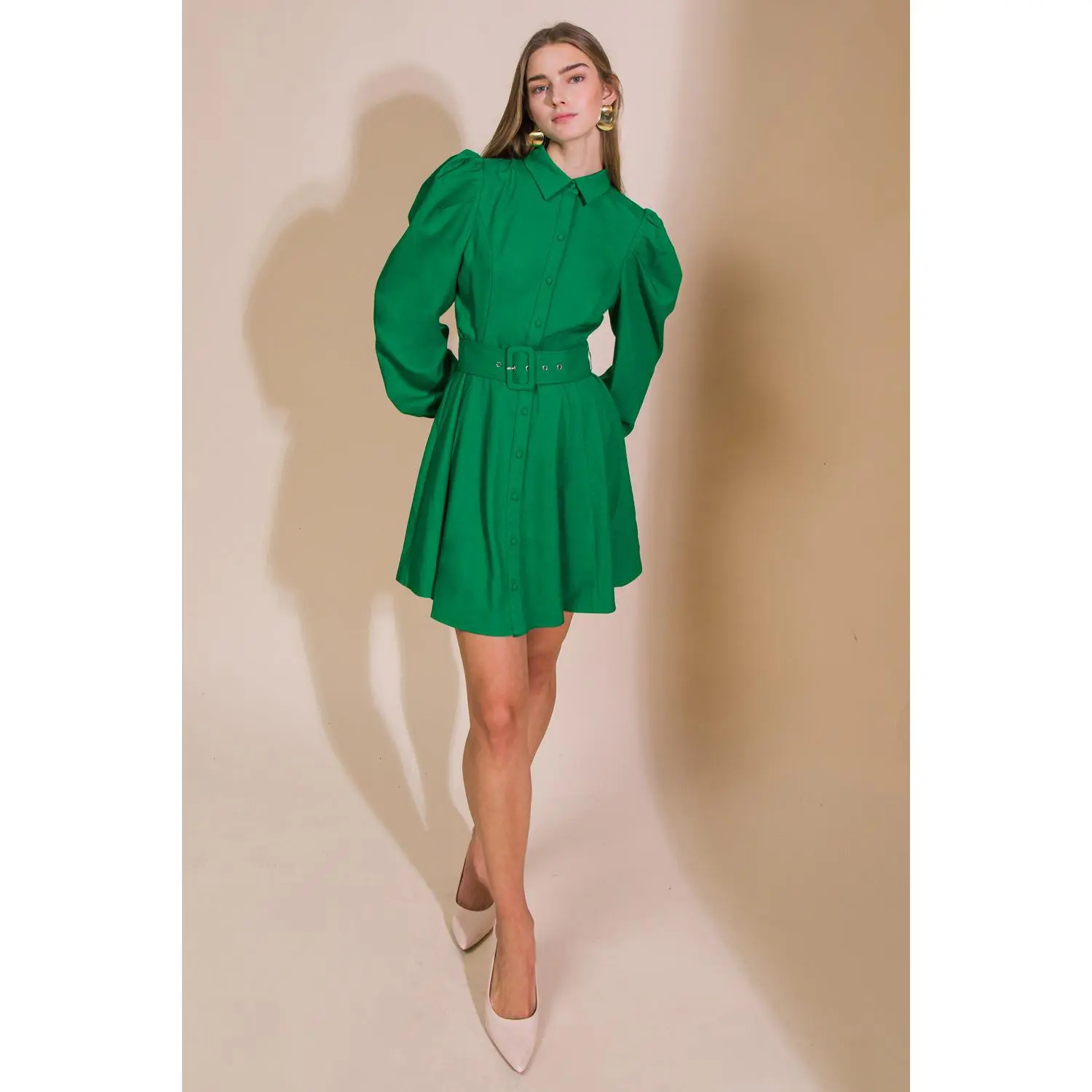 This WRAPPED UP IN LOVE MINI DRESS is a must-have timeless classic. It features long puff sleeve with cuff, shirt collar, button down, and A line skirt, accessorized with a self belt for an ultra-flattering silhouette. Perfect for any occasion, this solid woven dress will bring style and elegance to your look.