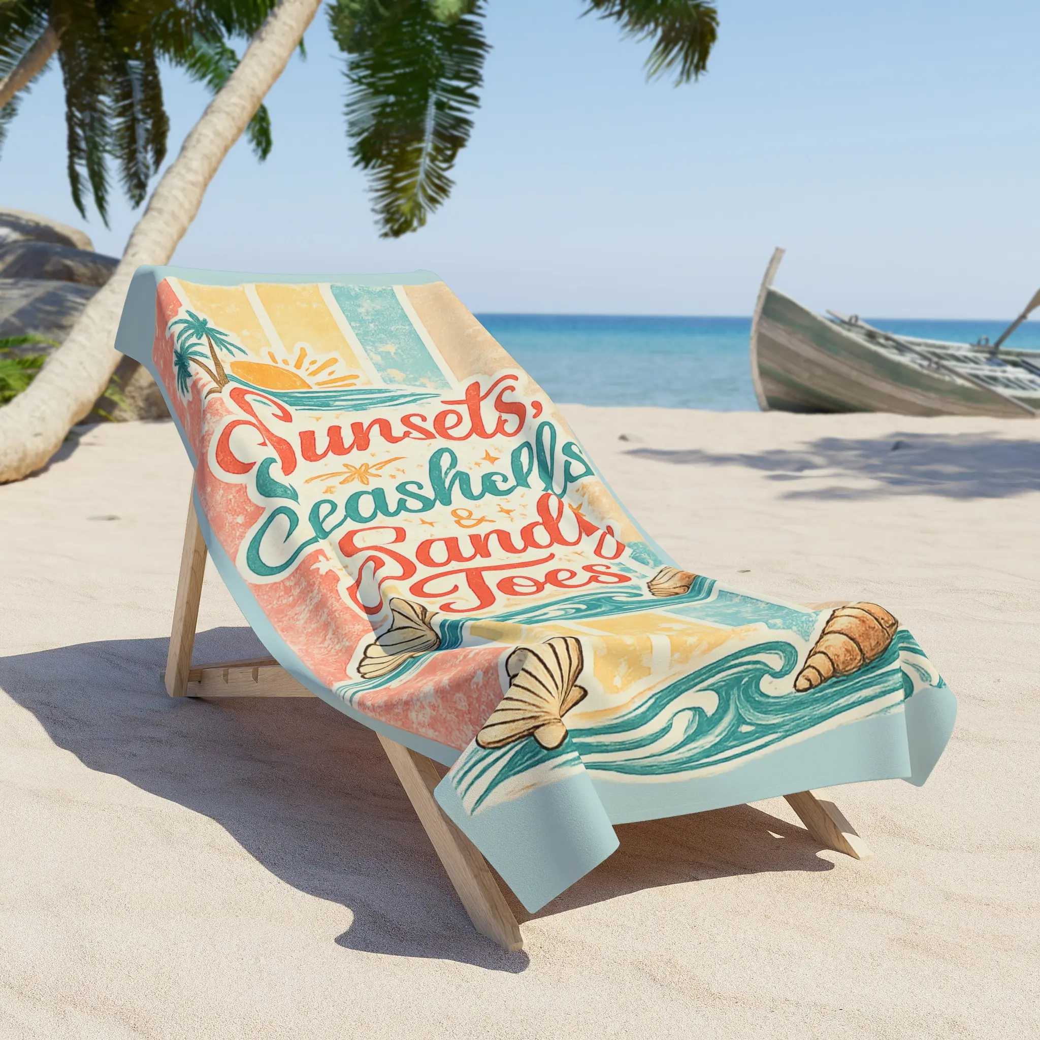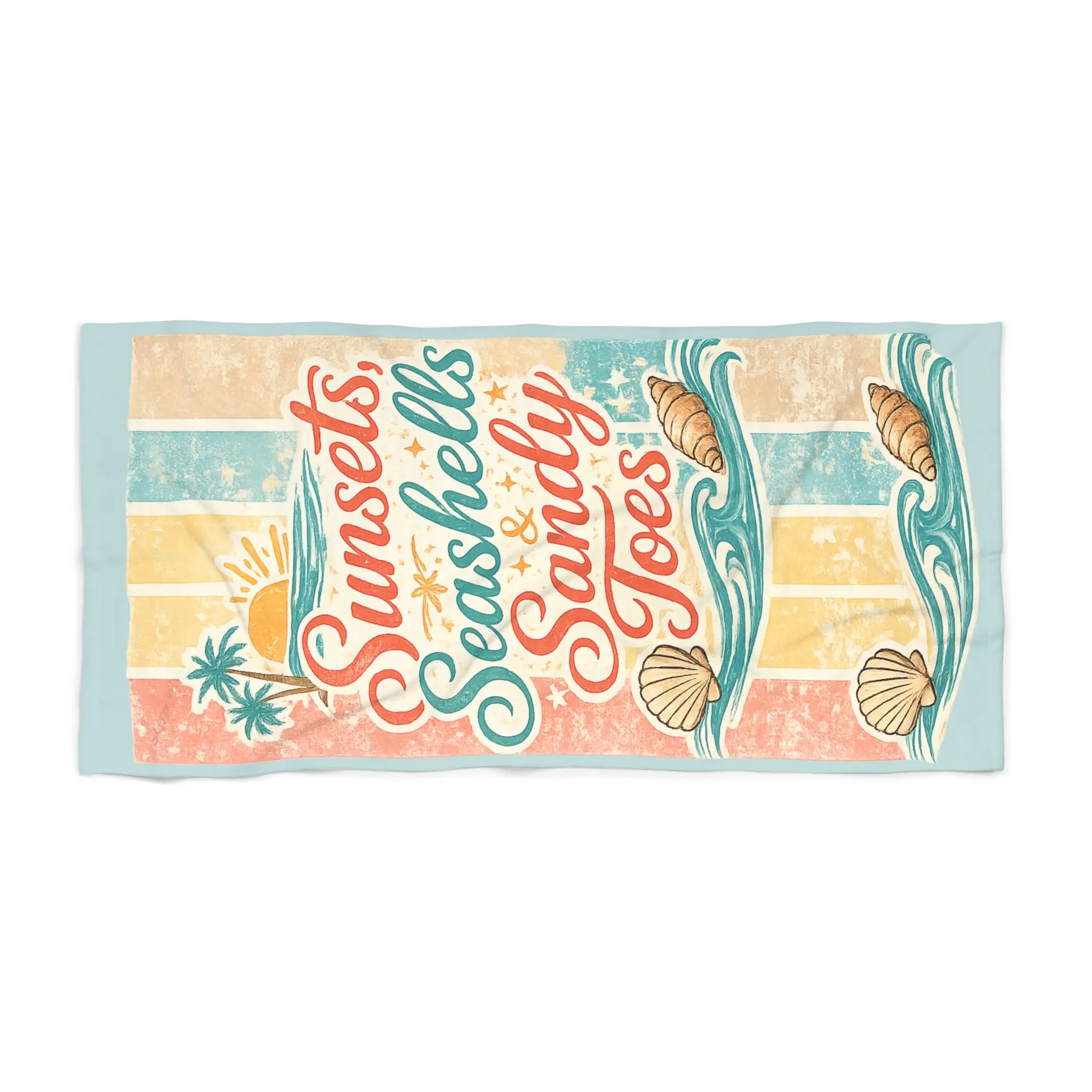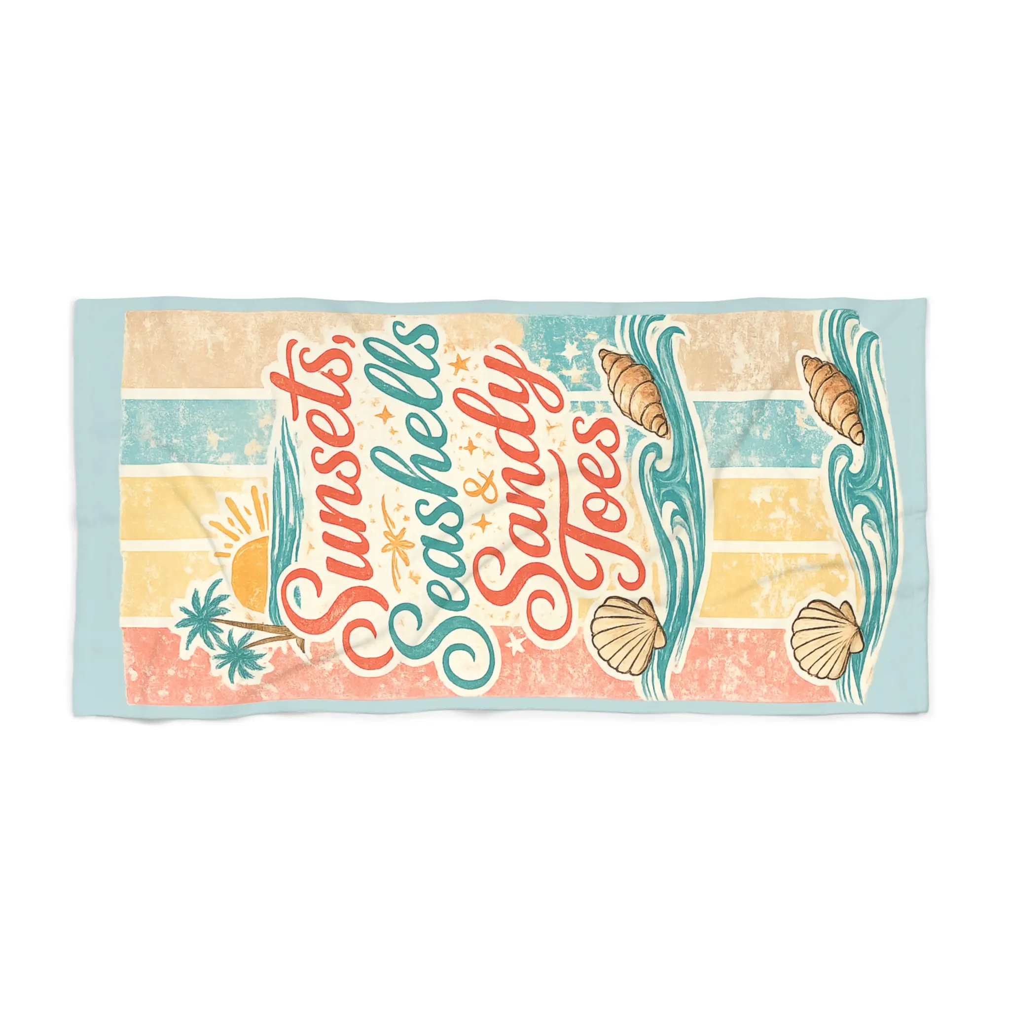 Salt on your skin. Warm dusk light. This beach towel carries a retro seaside vibe—faded stripes, shells, and a breezy hand-lettered phrase that invites you to slow down and watch the sun slip away. The plush cotton loop backing feels soft against bare feet and skin, while the quick-dry polyester print face keeps colors bright and resists clinging when damp. It’s large enough to stretch out on or fold over a lounger, and the hemmed edges hold up through sandy weekends and repeated washings. Bring it along to evening bonfires, lazy beach afternoons, or coastal road trips when you want something that looks lived-in and loved the moment you spread it out.