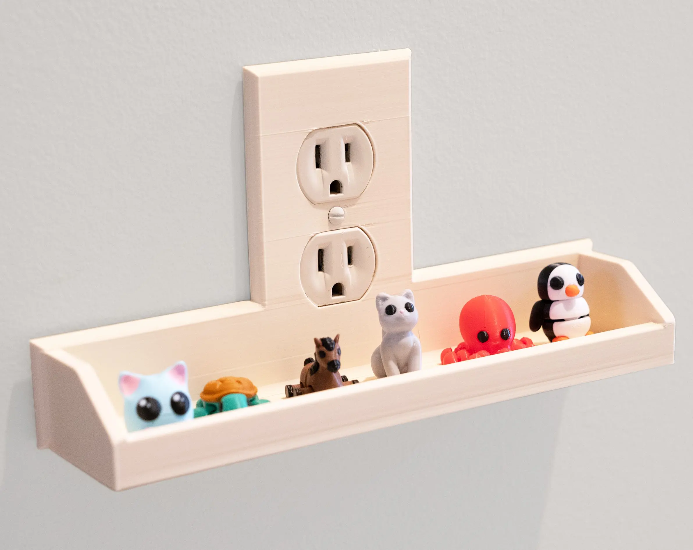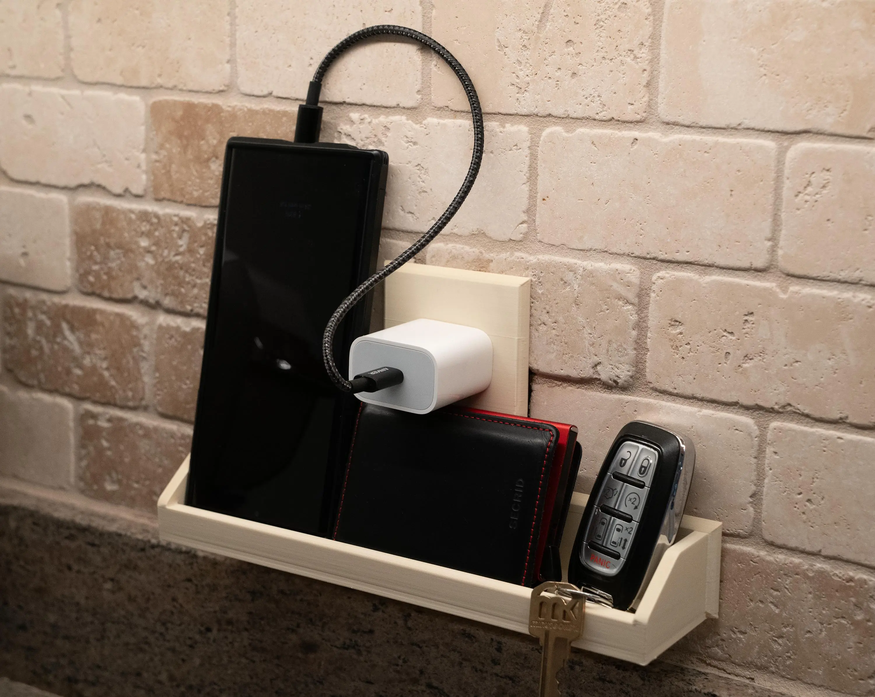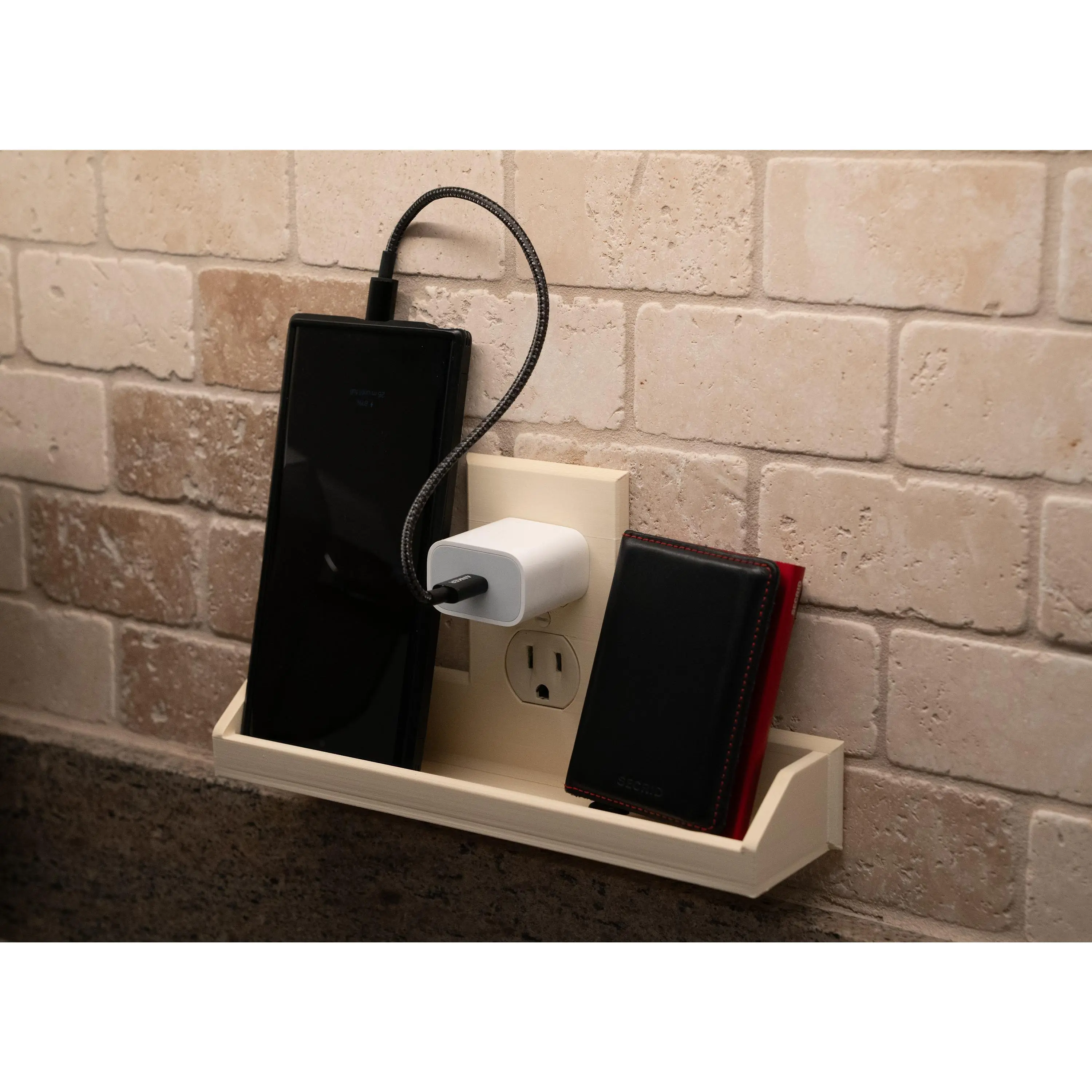 The wider Duo format allows two phones to rest and charge upside down simultaneously, keeping cables tidy and off the counter. It’s equally useful for small tools, cosmetics, wallets, keys, remotes, and even small 3D printed toys — turning underused wall space into purposeful storage.