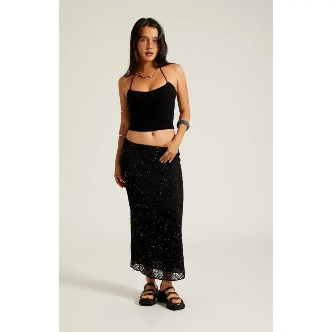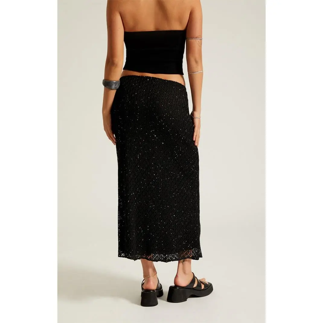The Sequin Midi Skirt from Beverly and Beck sparkles with glamorous, eye-catching style. Made from open-knit fabric with sequins throughout, it features a low-rise fit and elastic waistband for a comfortable yet show-stopping silhouette.