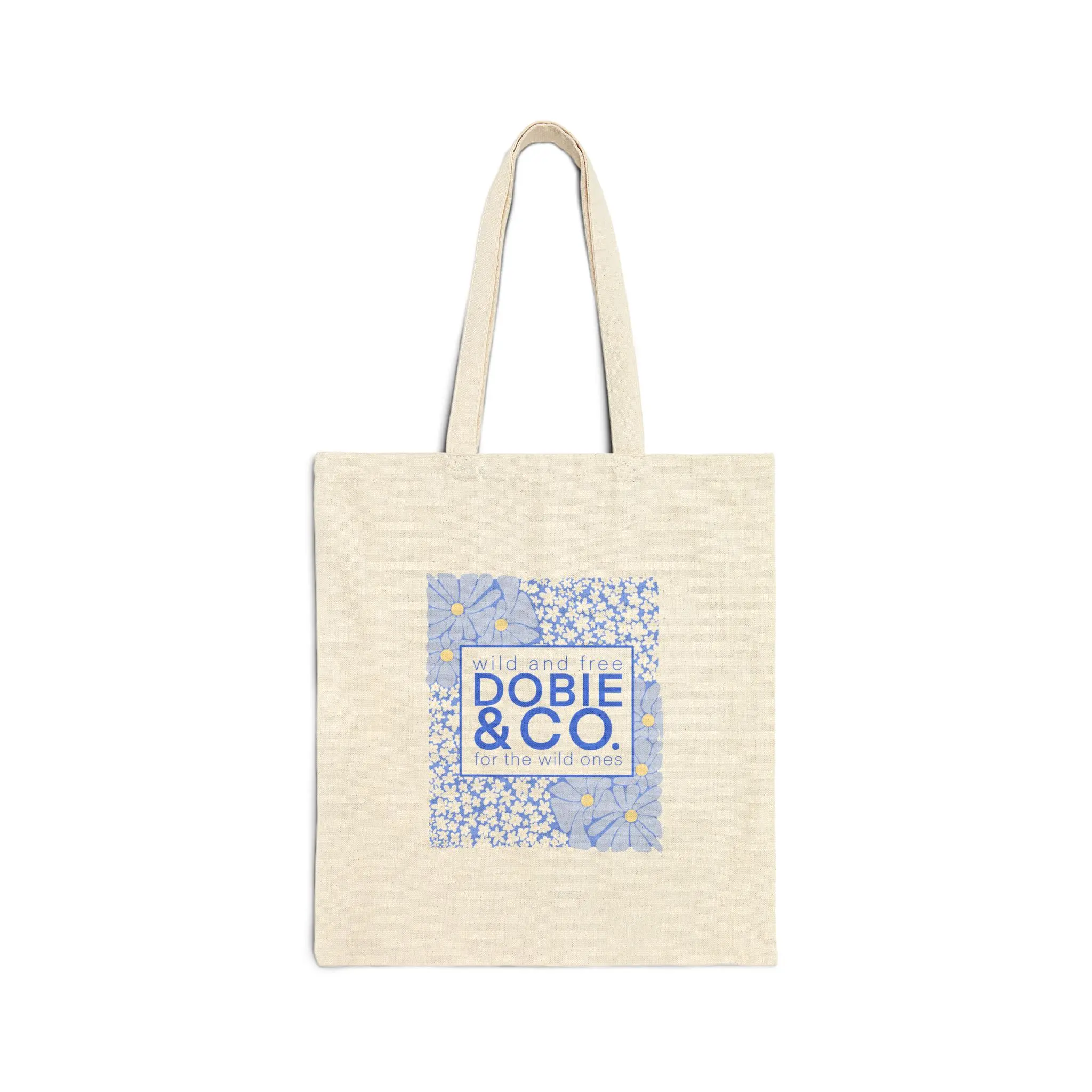 A roomy cotton canvas tote with a soft, vintage-inspired floral print in calming periwinkle and cream. The heavy 12 oz canvas holds its shape and carries groceries, market finds, or notebooks without sagging. Long, reinforced self-fabric handles sit comfortably on the shoulder. The flat-corner construction gives a clean, boxy silhouette that layers a quiet, cottage-core aesthetic over everyday errands or weekend market runs. Hand-drawn daisies and scattered buds create a gentle, nostalgic mood — the kind that makes you pause for a breath on a sunlit walk. This tote reads like a little love note to slow days and small rituals, made to be used and worn in the rhythm of daily life.
