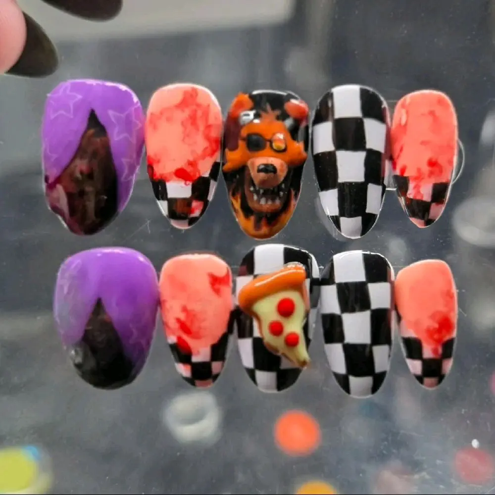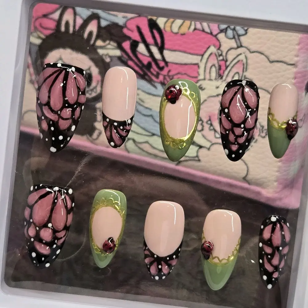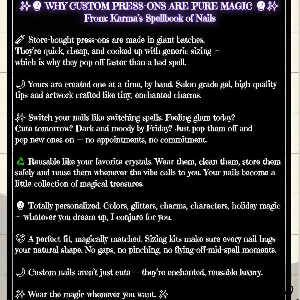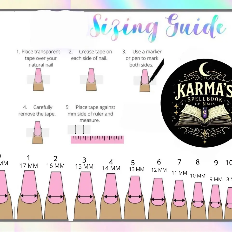 Hand made press on nails. I use Gel X nails with Gel polish. (Gel polish may contain hema). See image for instructions on how to find your size. Message me inspo photos to see if I am able to do the design you are looking for 🙂