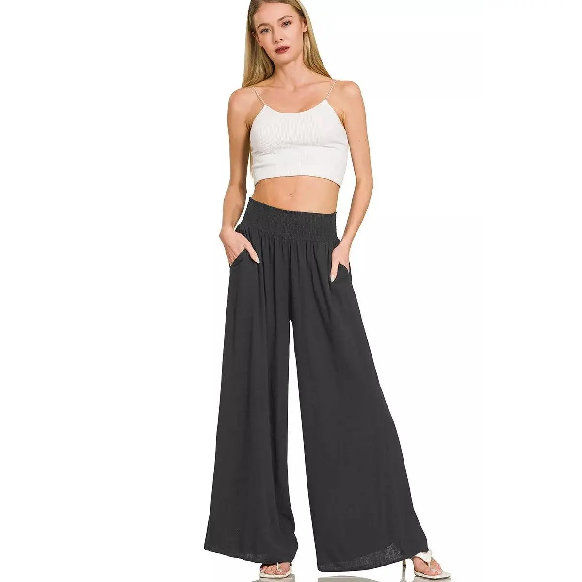 The Smocked Waistband Wide Leg Lounge Pants are the epitome of comfort and style. The smocked waistband provides a stretchy and adjustable fit for all-day wear. The wide-leg design gives these pants a relaxed and flowy silhouette that is perfect for lounging or running errands. Made from soft and breathable fabric, these lounge pants are ideal for both relaxing at home and stepping out in casual style. Elevate your loungewear game with these trendy and comfortable wide-leg pants that blend fashion and comfort effortlessly.