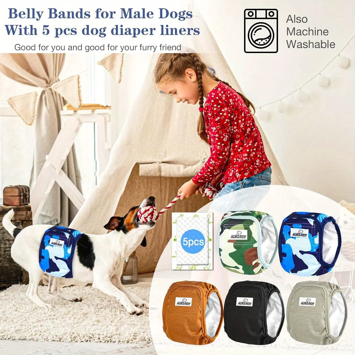 Cozy Dog Diapers: Featuring elastic on the sides rather than underneath, these belly bands for male dogs prevent rigid elastic from putting pressure on the male genitalia, and the soft edges ensure your puppy's comfort during prolonged use.The ALWZ-RDY dog wraps offer a secure fit with a new hook and loop closure that prevents snagging on carpets and furniture.This feature allows you to adjust the waist size for a better fit, enabling your pet to move around the house comfortably.The dog belly band features two layers of super absorbent pads that effectively soak up urine, with the outer layer being completely , protecting your carpets, couches, and furniture from unpleasant wet stains and odors.Male dog diapers that can be reused: These washable diapers are sturdy and can endure numerous washes, reducing the necessity to buy disposable ones often, thus saving you a significant amount of money.Value Pack: This set includes 5 male dog belly bands in sizes XS/S/M/L/XL and 5 dog diaper liners for extra absorbency, suitable for waists measuring 9" to 11". It's ideal for untrained puppies and dogs experiencing incontinence from excitement, aging, or health issues.