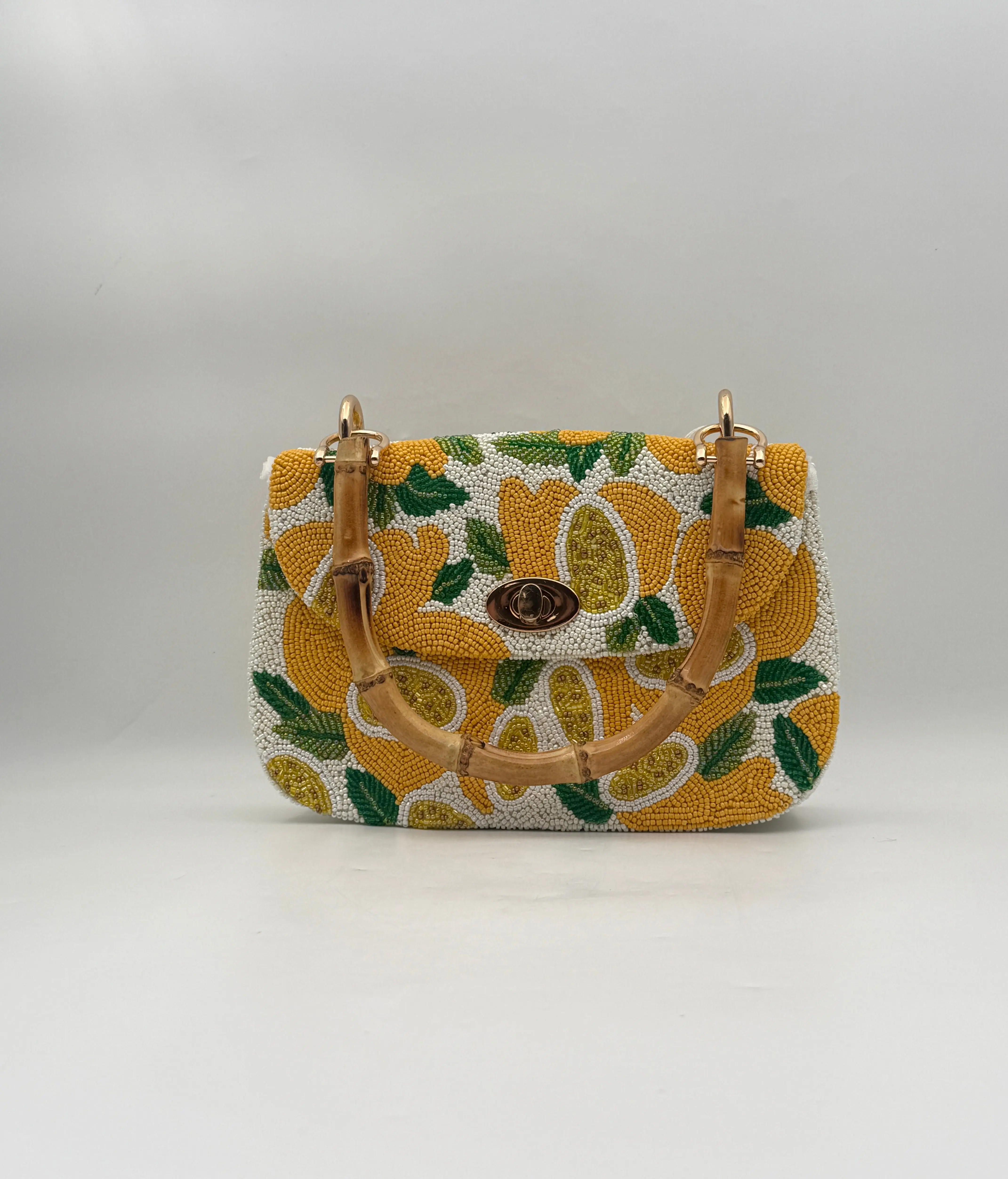 Hand-beaded handbag featuring a vibrant lemon and leaf motif with a natural bamboo handle. Dimensions: 9" W x 6" H x 2" D Condition: New Key Features: