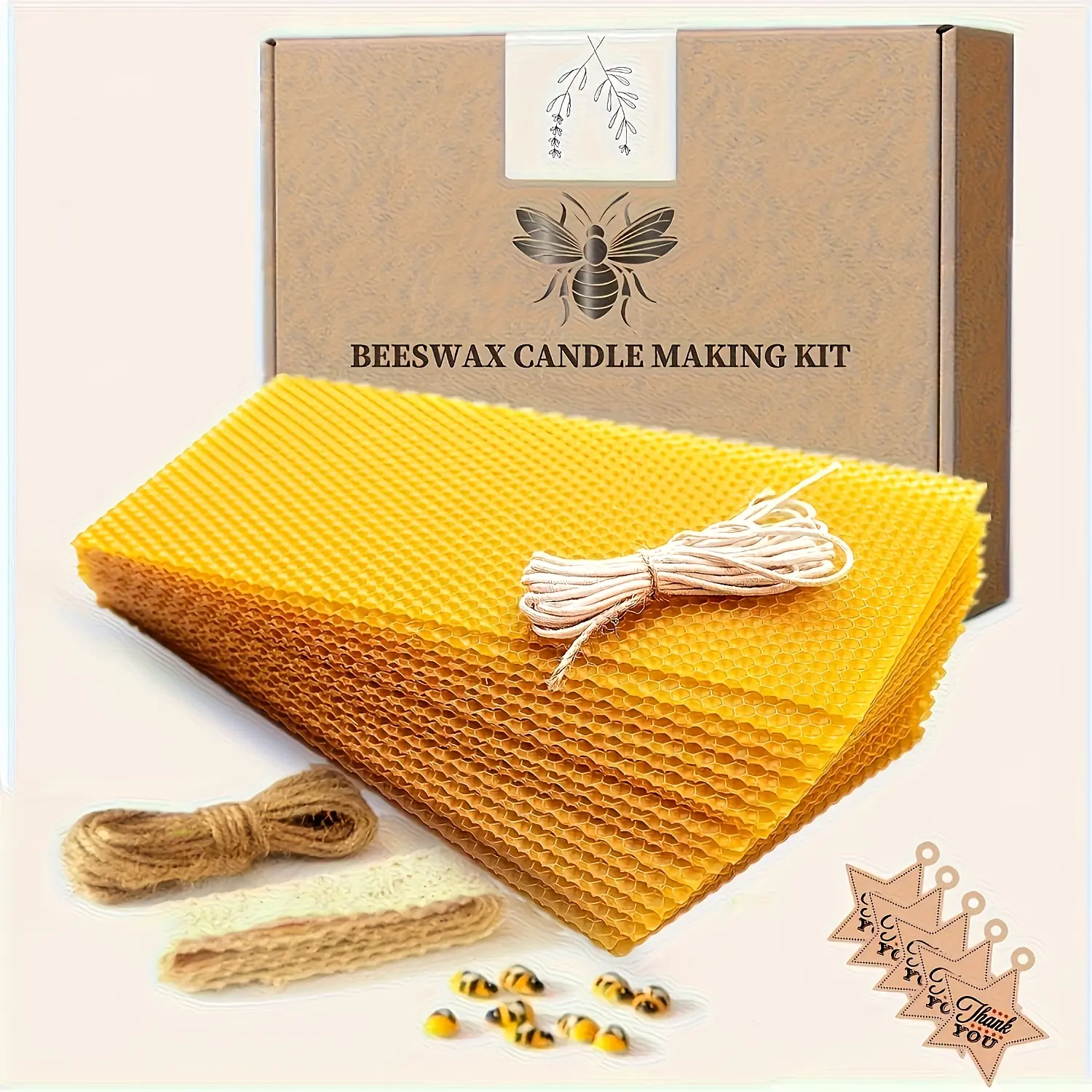 This complete kit includes 14 vibrant rainbow-colored beeswax sheets (6×8"), cotton wicks, natural jute cords, decorative lace trim, and star-shaped gift tags. Everything you need to make custom hand-rolled candles is packed in a bee-themed gift box.