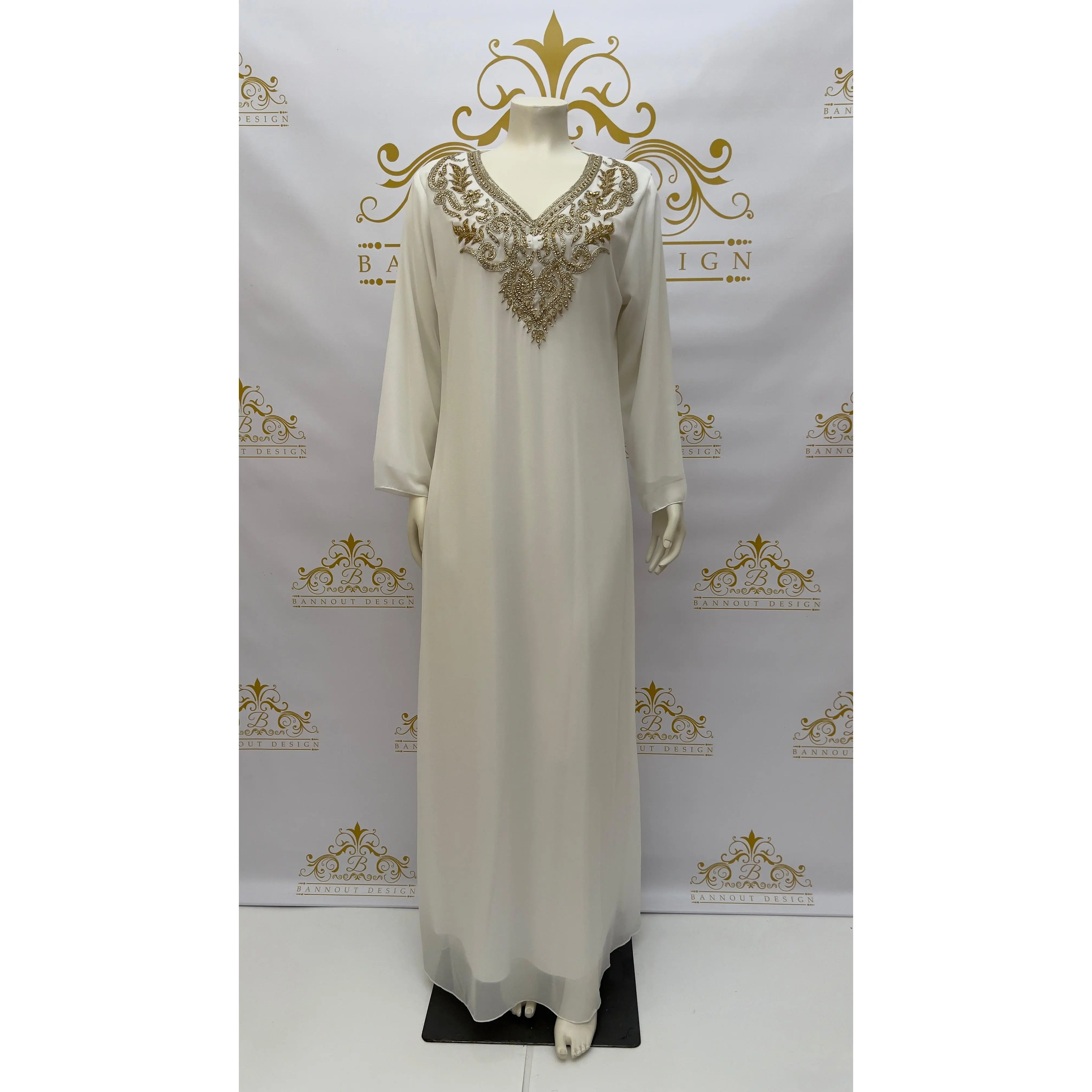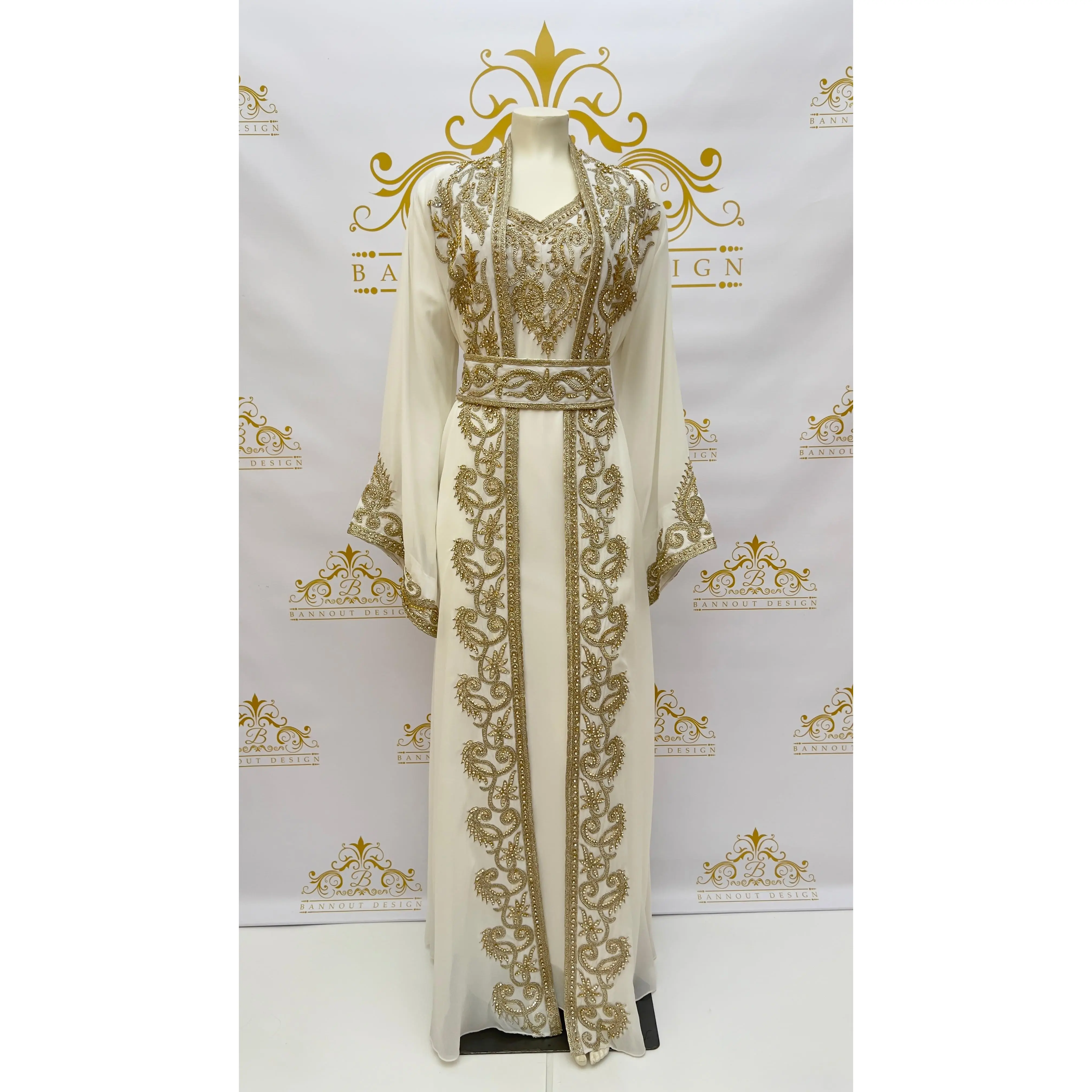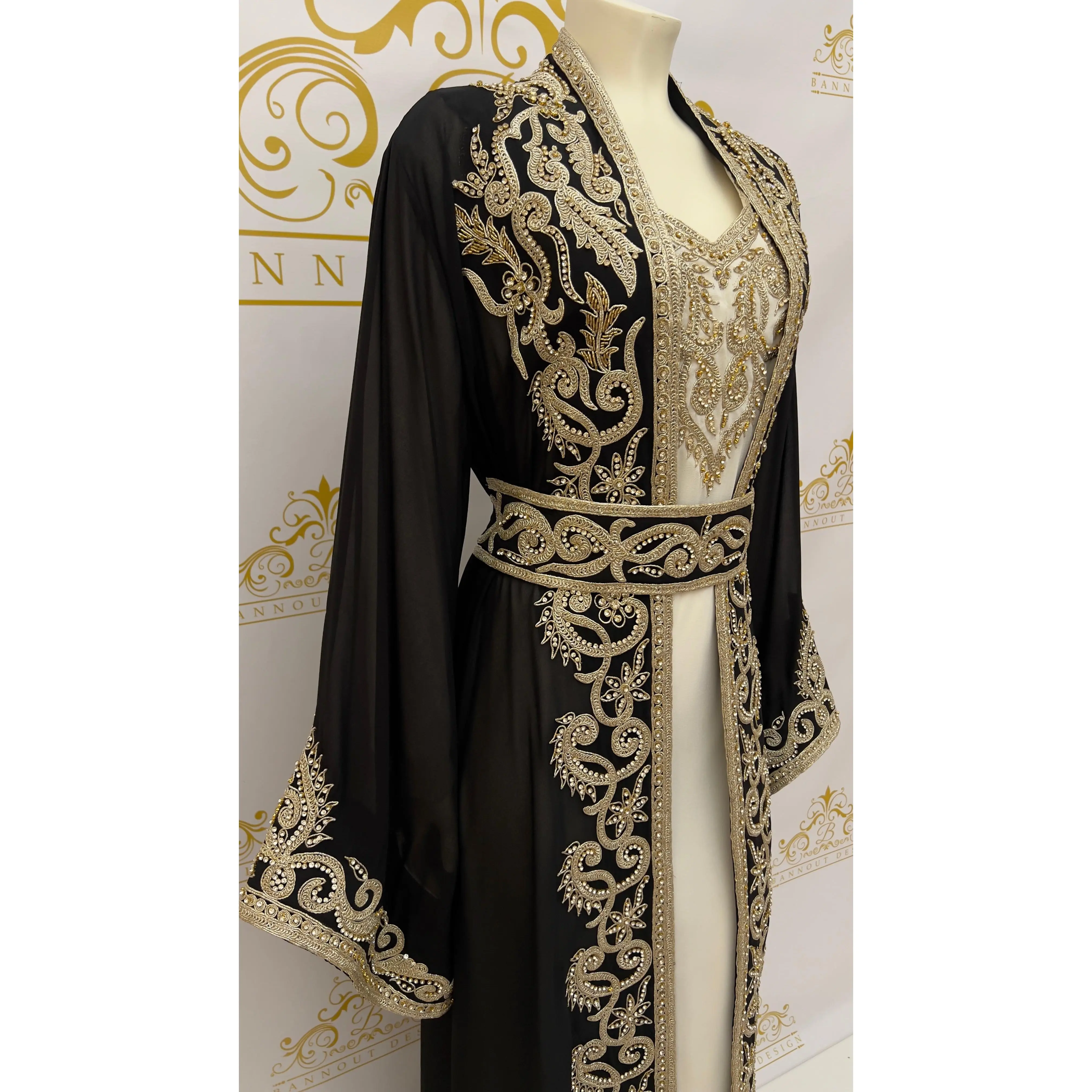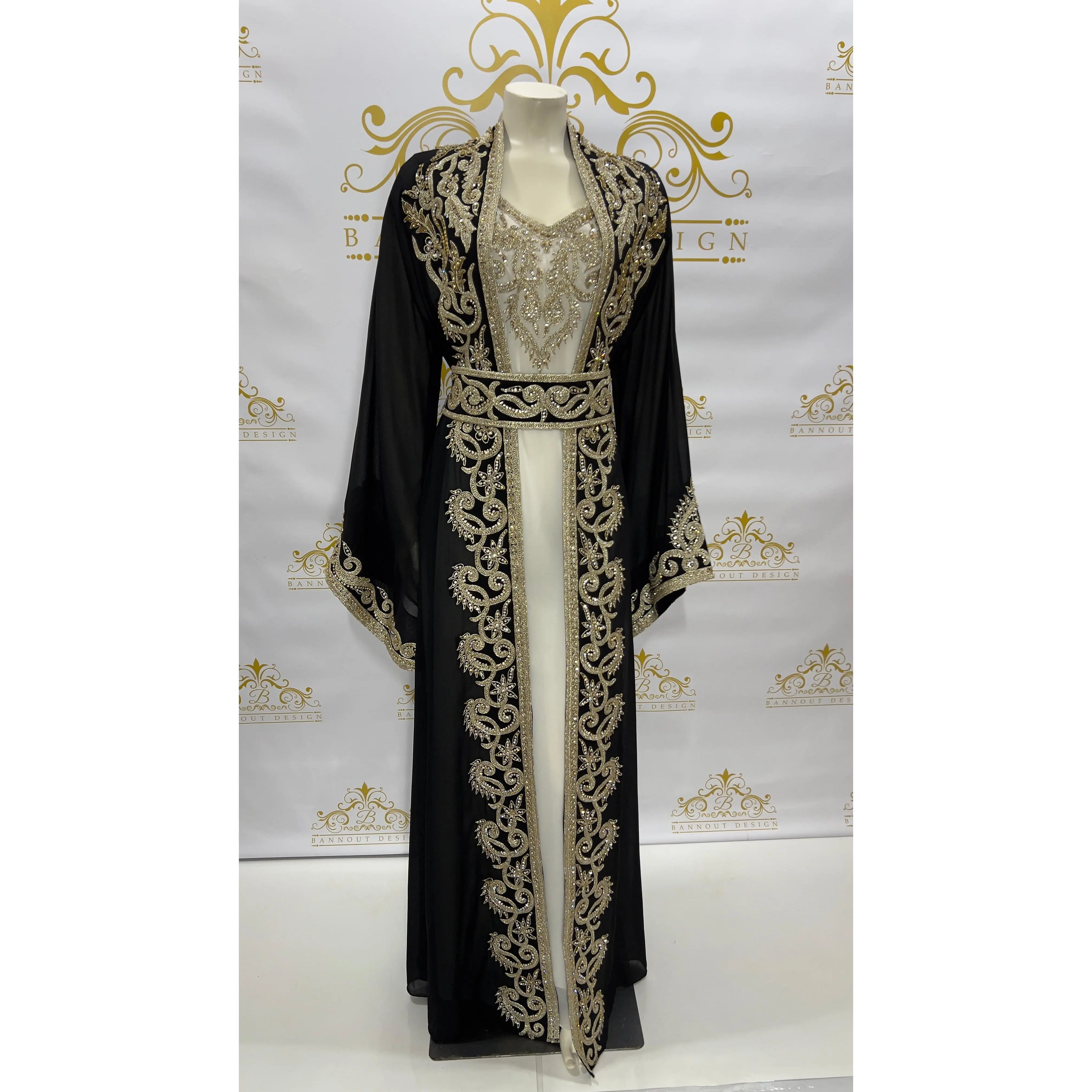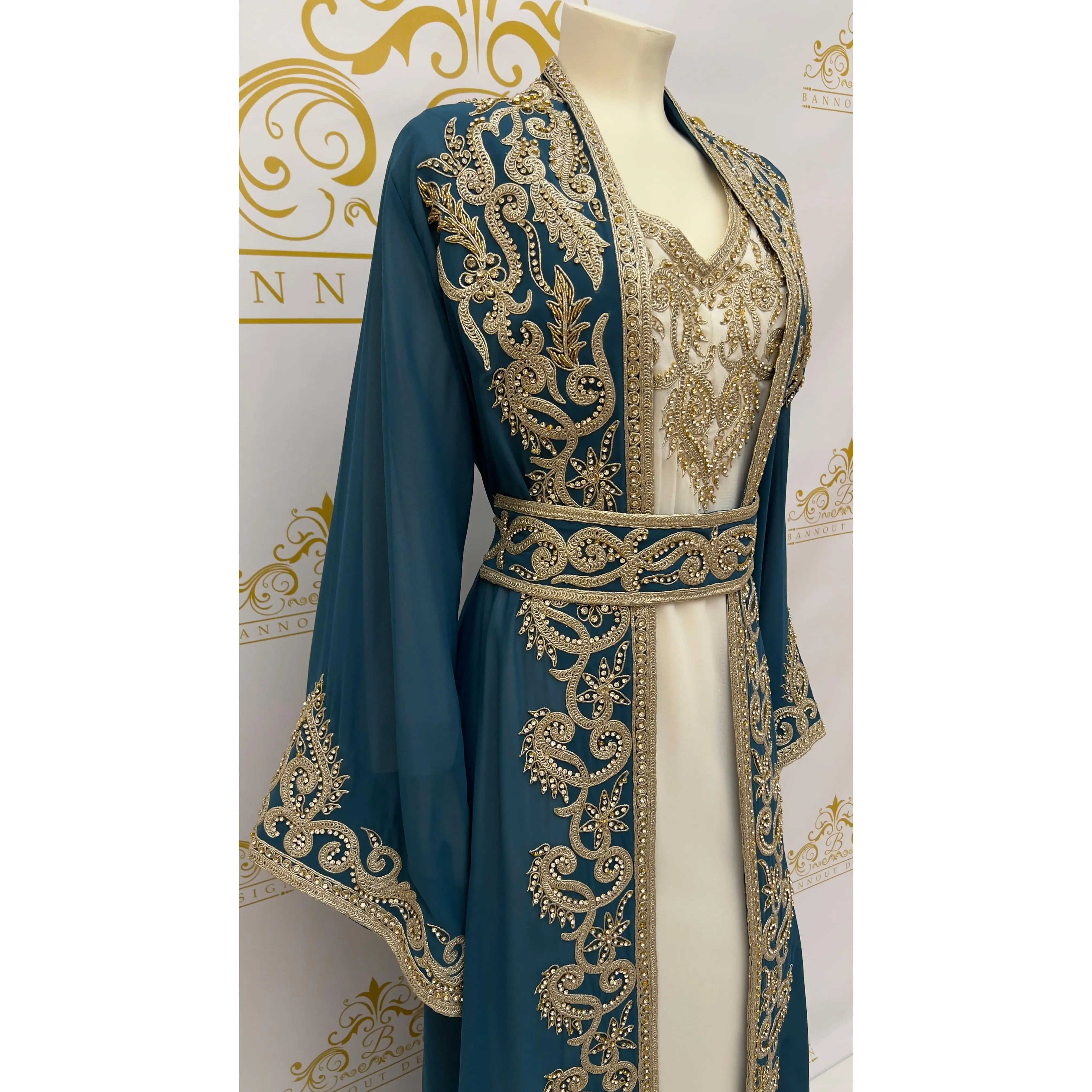 Upgrade your wardrobe with our Fancy Kaftan Abaya 3 Pcs. This women's maxi dress features long sleeves and is embellished with elegant embroidery designs and golden beads. Experience the perfect blend of comfort and style. Elevate your look for any occasion.