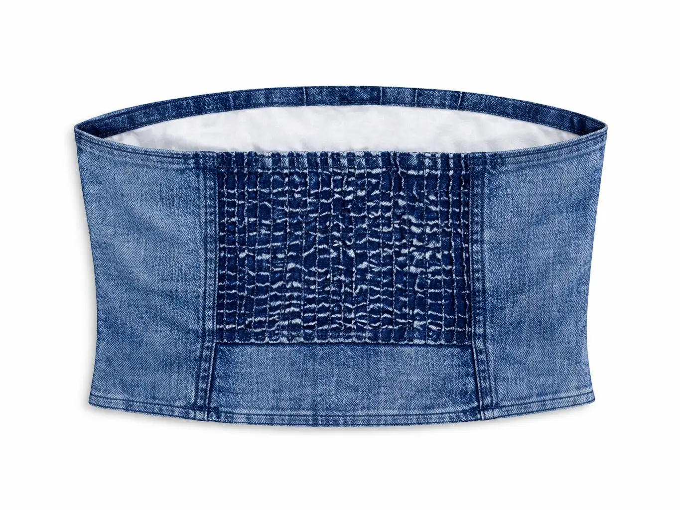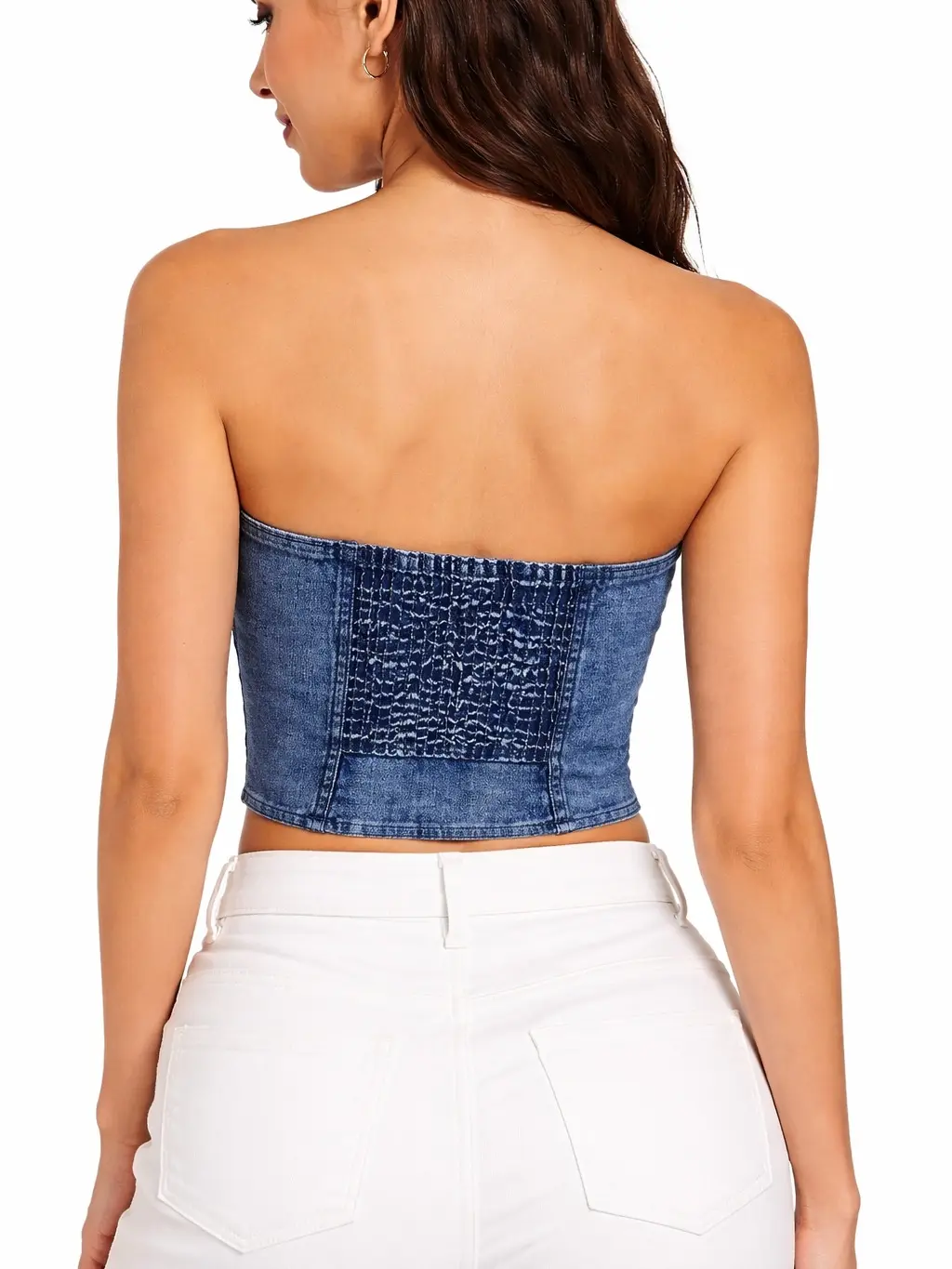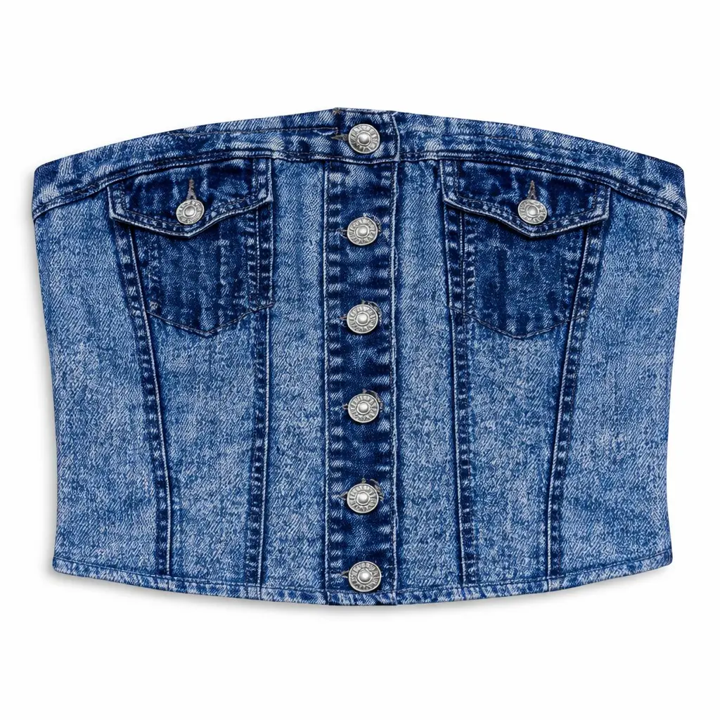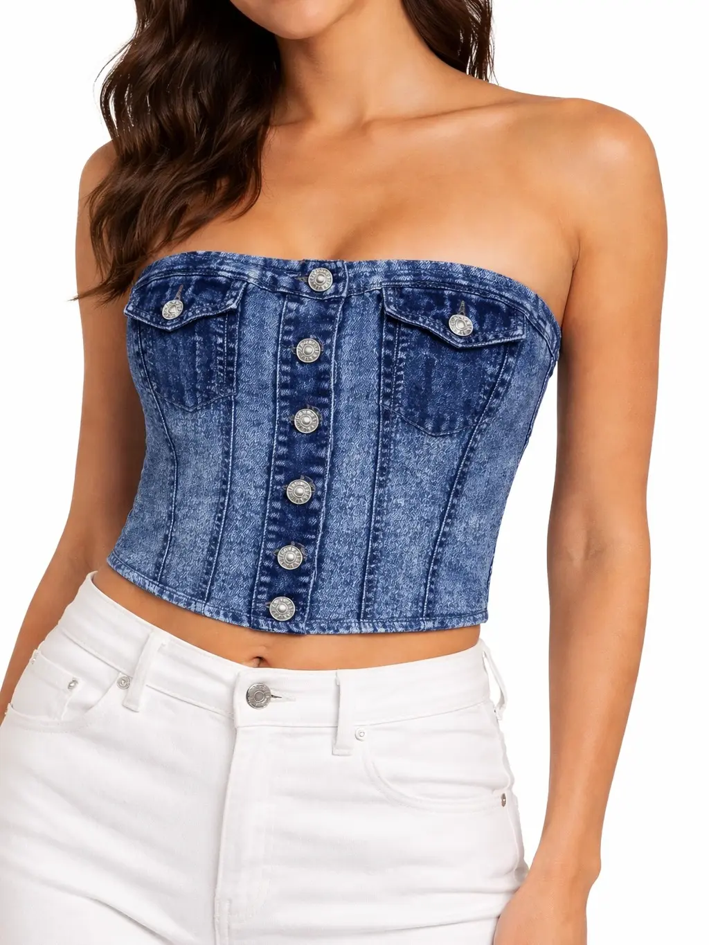 Diseñado para resaltar tu figura, este top strapless combina un look sexy y moderno con detalles únicos como botones frontales y bolsillos decorativos que le dan un toque edgy y fashion-forward