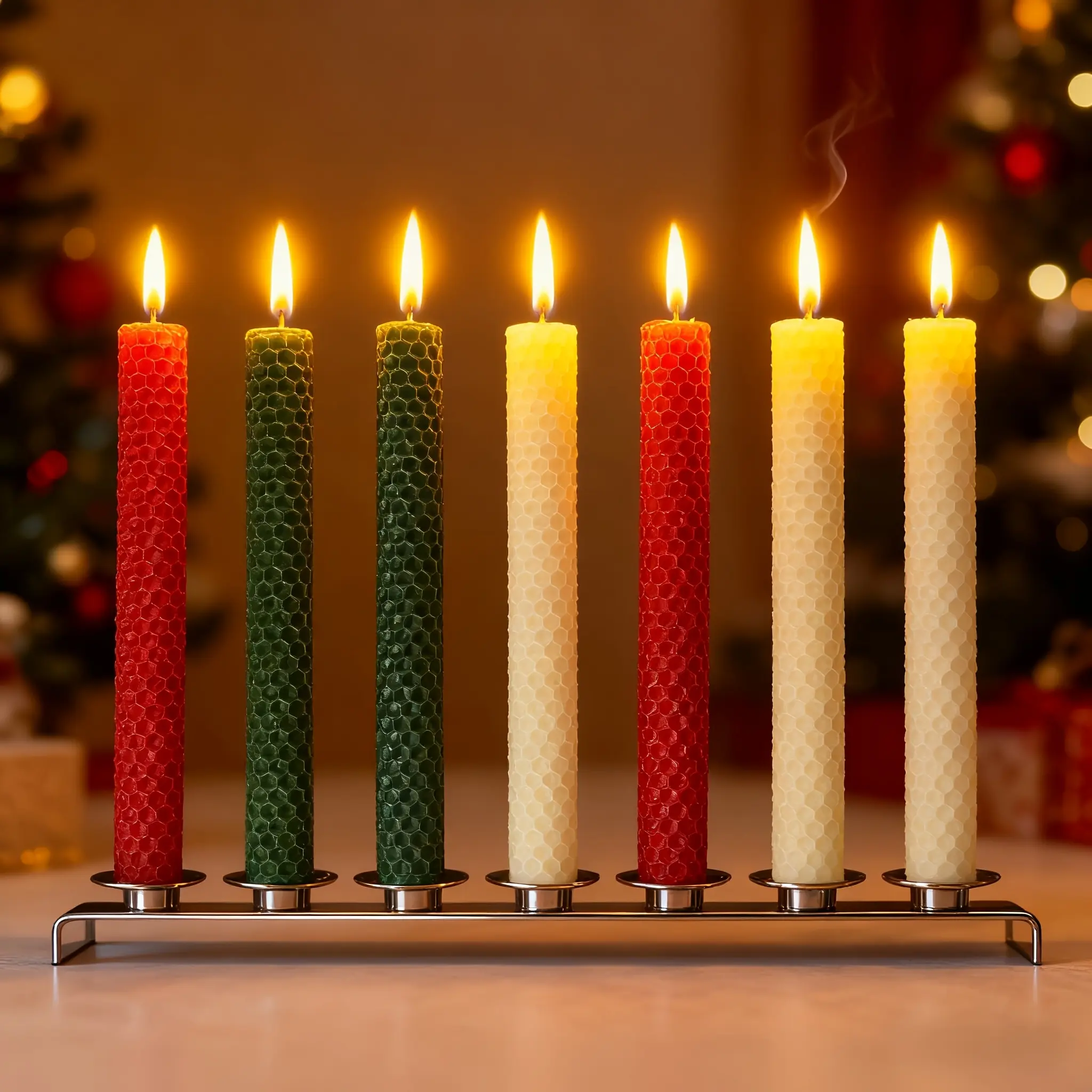 The kit features classic Christmas hues: vibrant red, warm yellow, crisp white, and forest green beeswax sheets. The iconic honeycomb texture makes rolling easy, while the natural beeswax emits a subtle honey scent.