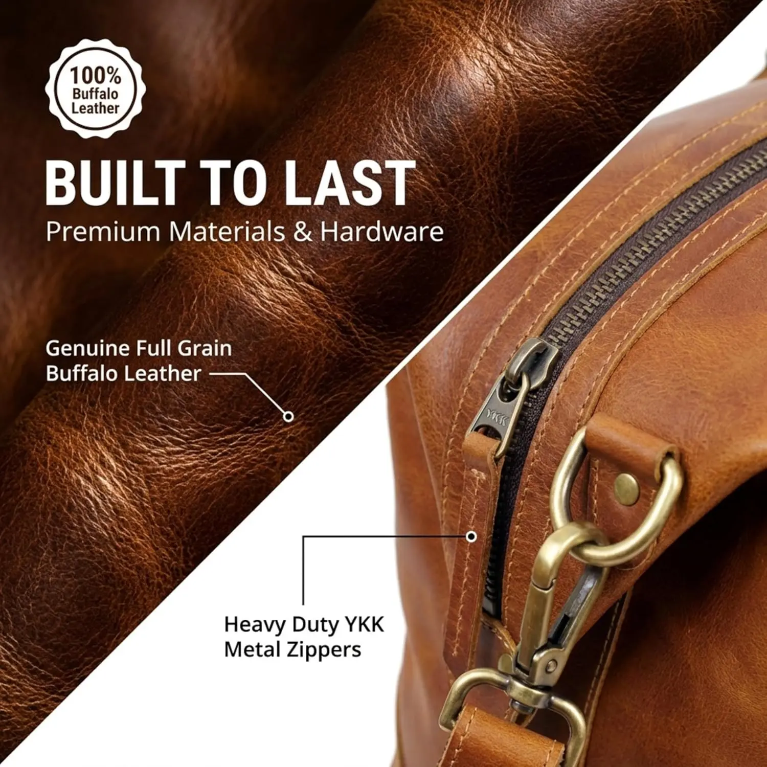 Full Grain Leather Duffle Bag for Men, Buffalo Overnight Weekend Travel Bag, Carry On with Organized Pockets, YKK Zippers, Adjustable Strap (Tan, 24 Inch)
