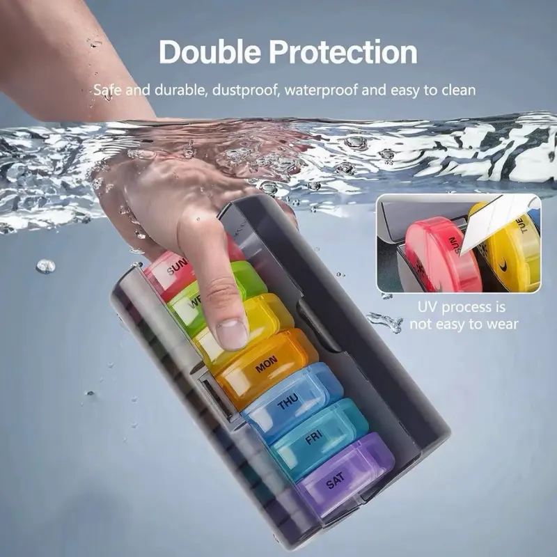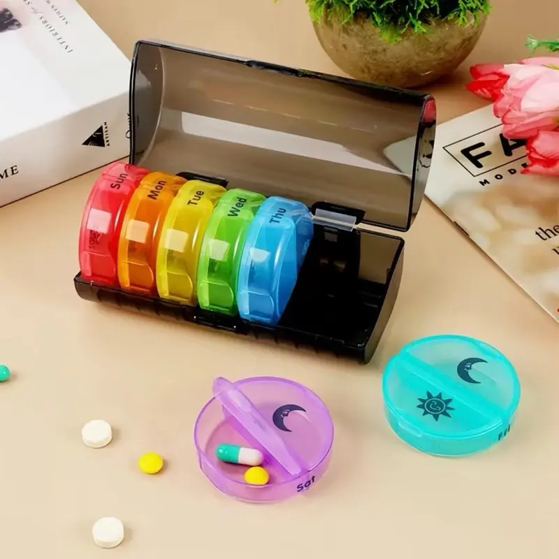 (Weekly Organizer) : This pill organizer features 7 compartments for each day, perfect for managing medications effectively.