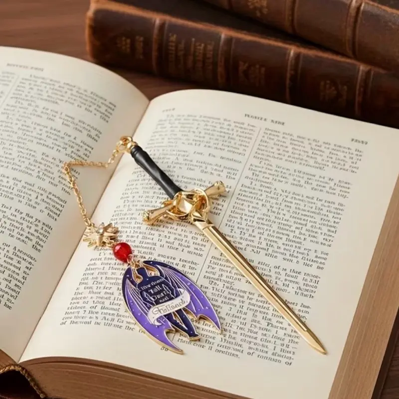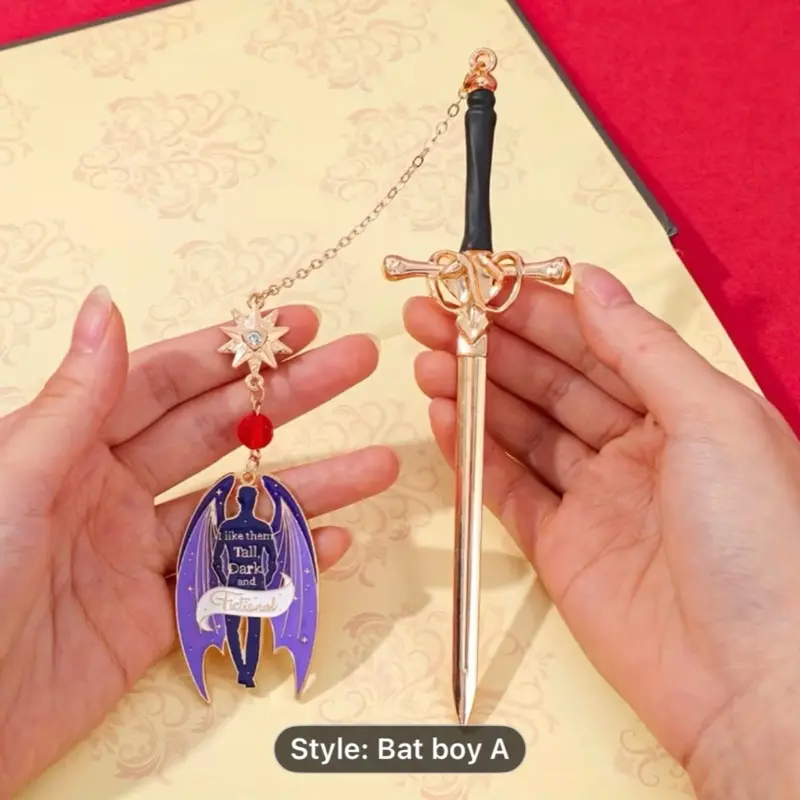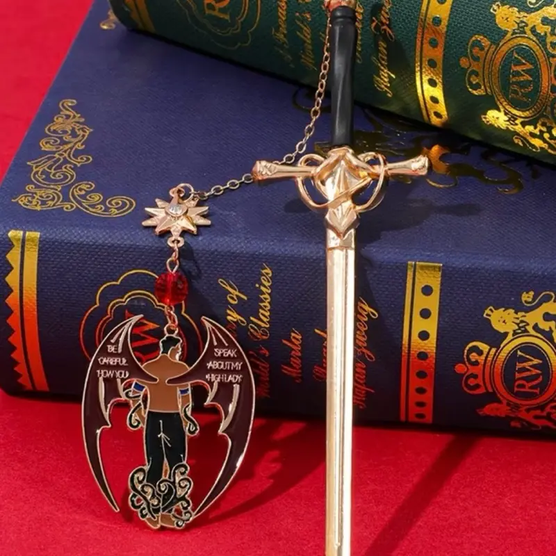 These ACOTAR-inspired sword bookmarks are the perfect blend of elegance and fantasy. Each piece features a sleek miniature sword design adorned with celestial details, bat wings, and deep Night Court vibes—complete with shimmering accents and a striking red gem charm for that extra touch of power and mystery.