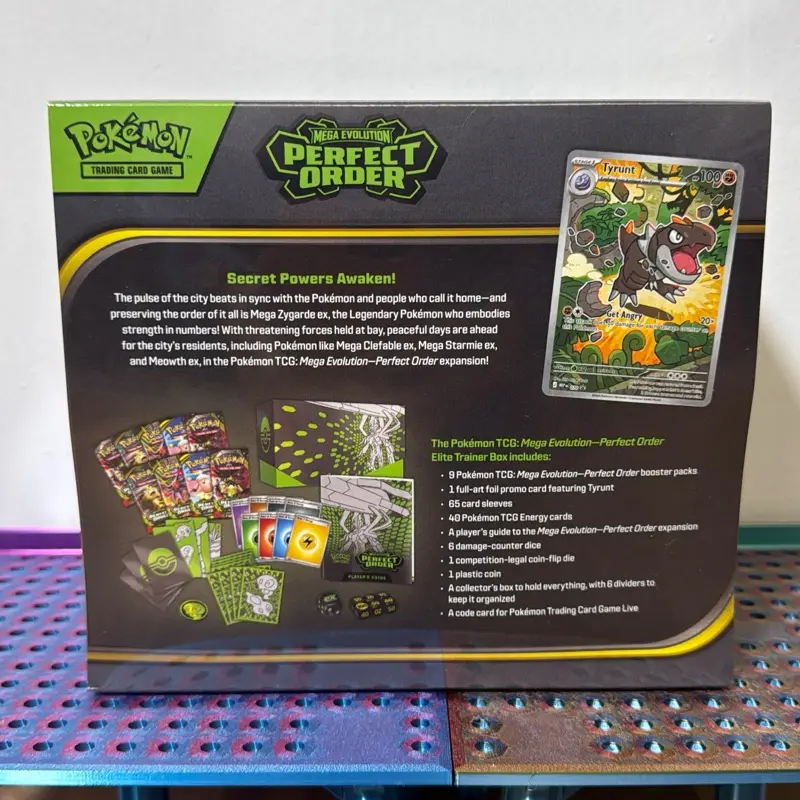 This elite trainer box comes with nine packs of Perfect Order, 65 card sleeves, one full art promo and everything else you need to enjoy the Pokemon TCG!