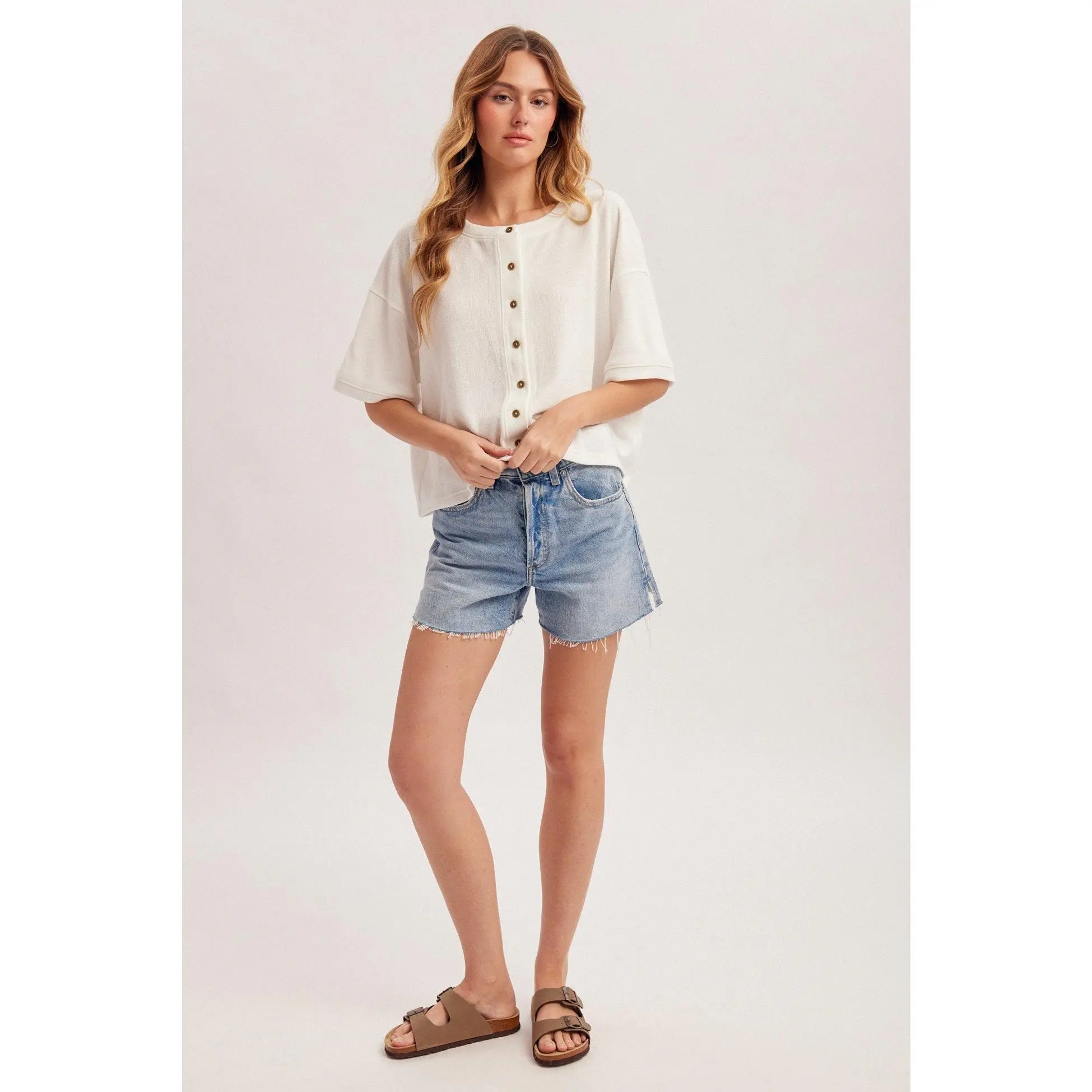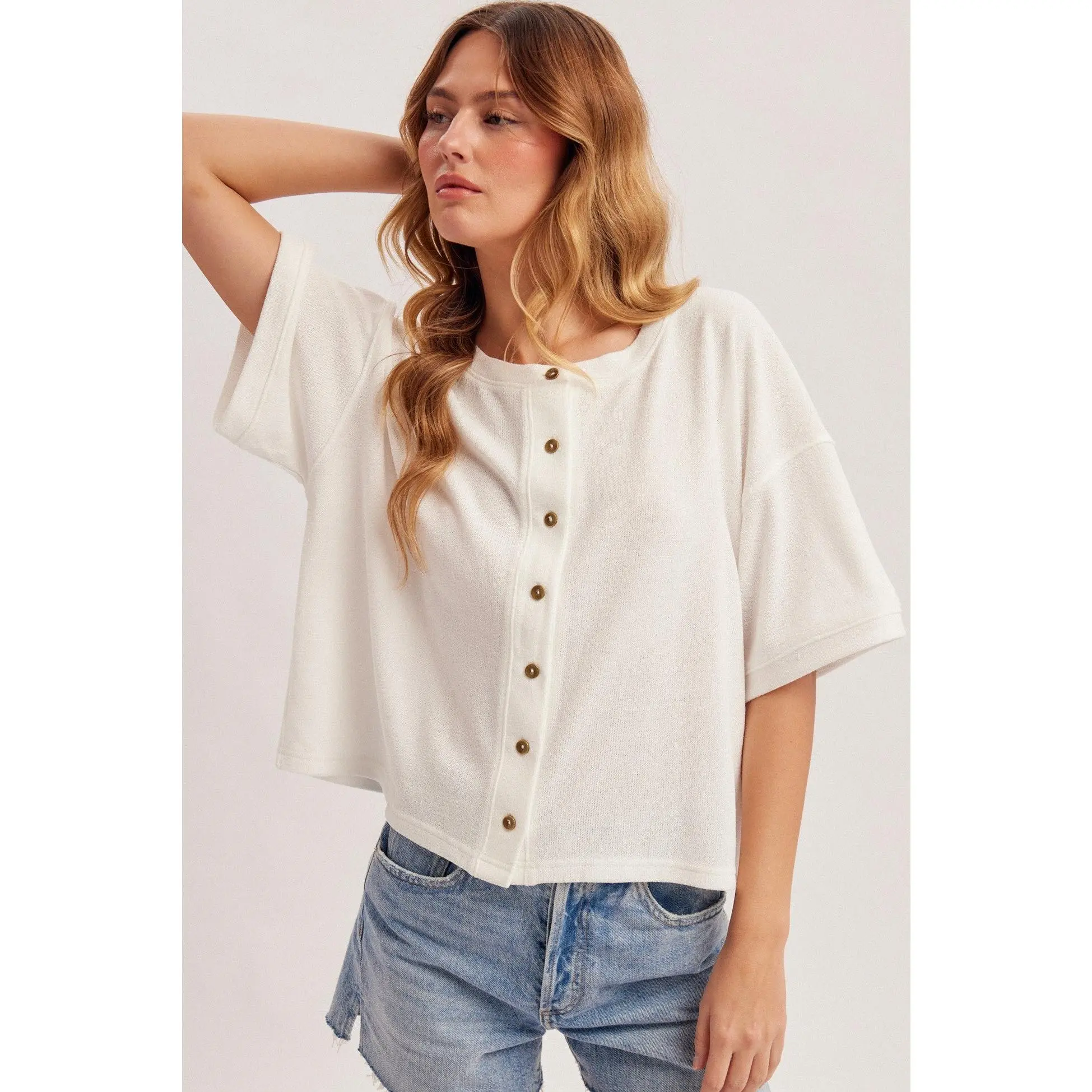The Torrie Crew Button Up brings effortless style to your everyday wardrobe. This boxy fit button-down cardigan-style tee features a relaxed, comfortable silhouette that works perfectly layered or worn solo. Crafted from a premium blend of 97% polyester and 3% spandex, it offers gentle stretch for all-day wearability while maintaining its shape. The crew neckline and button-up front make it versatile enough to dress up or down, making it an essential piece for any season.