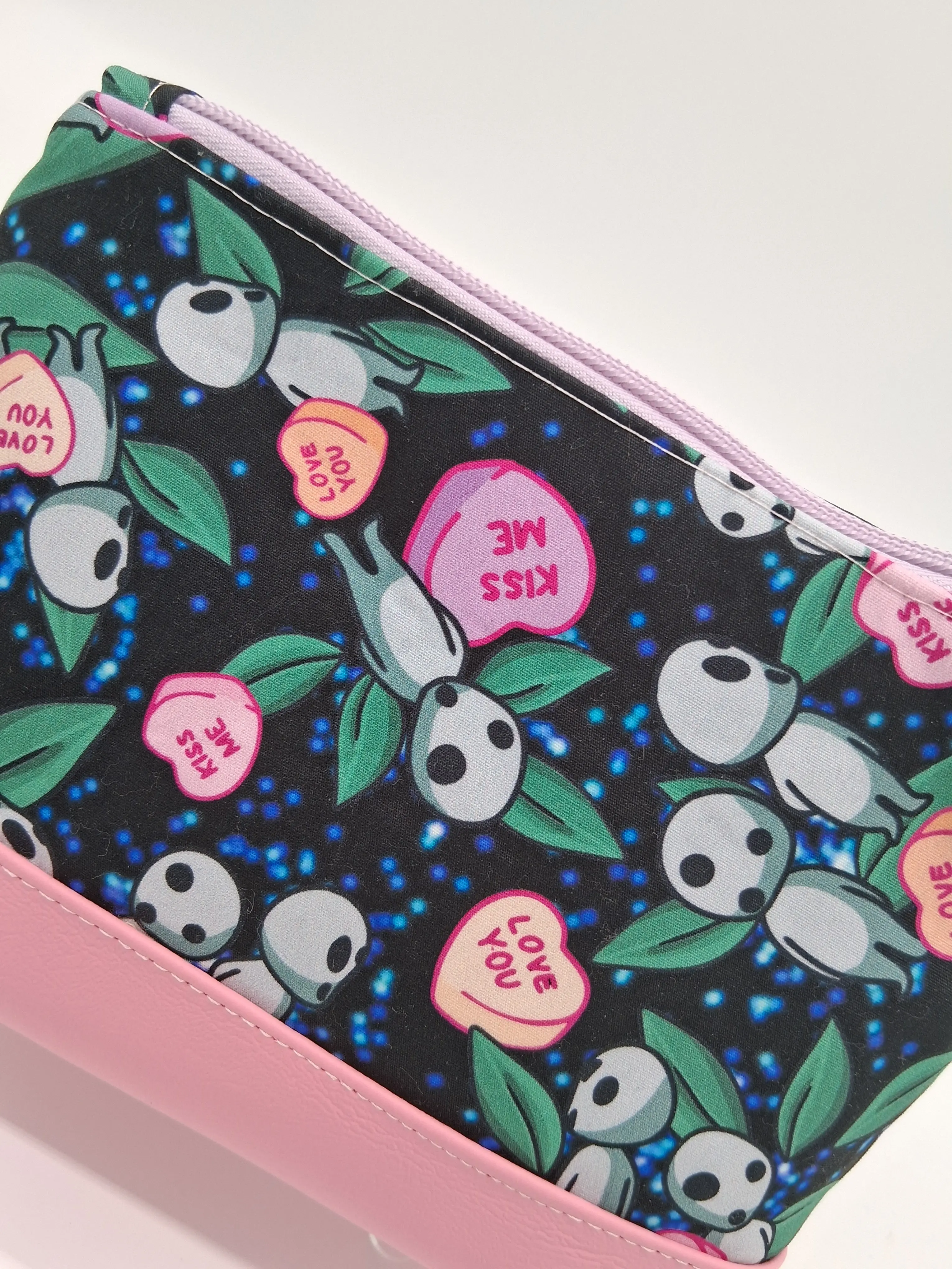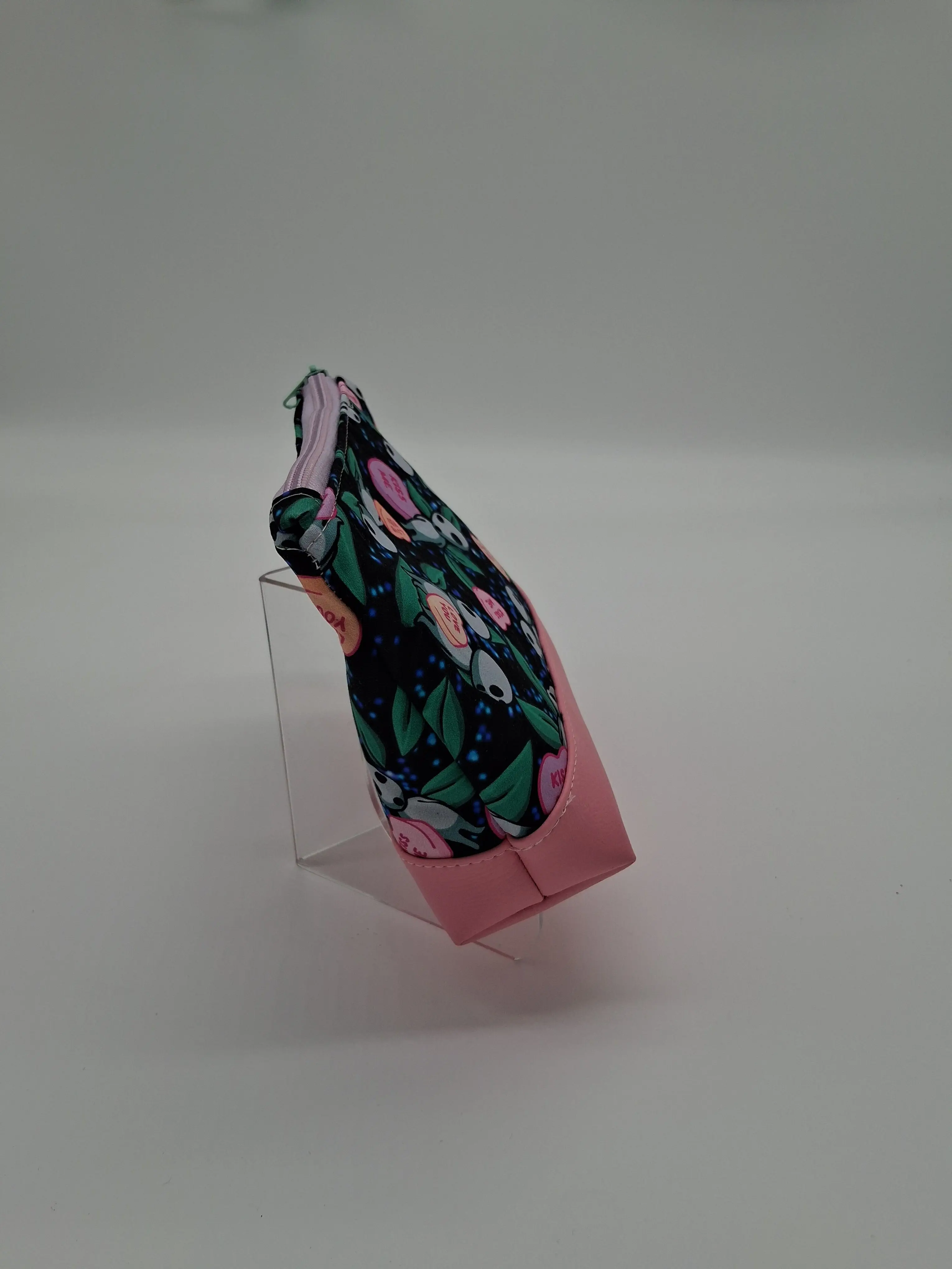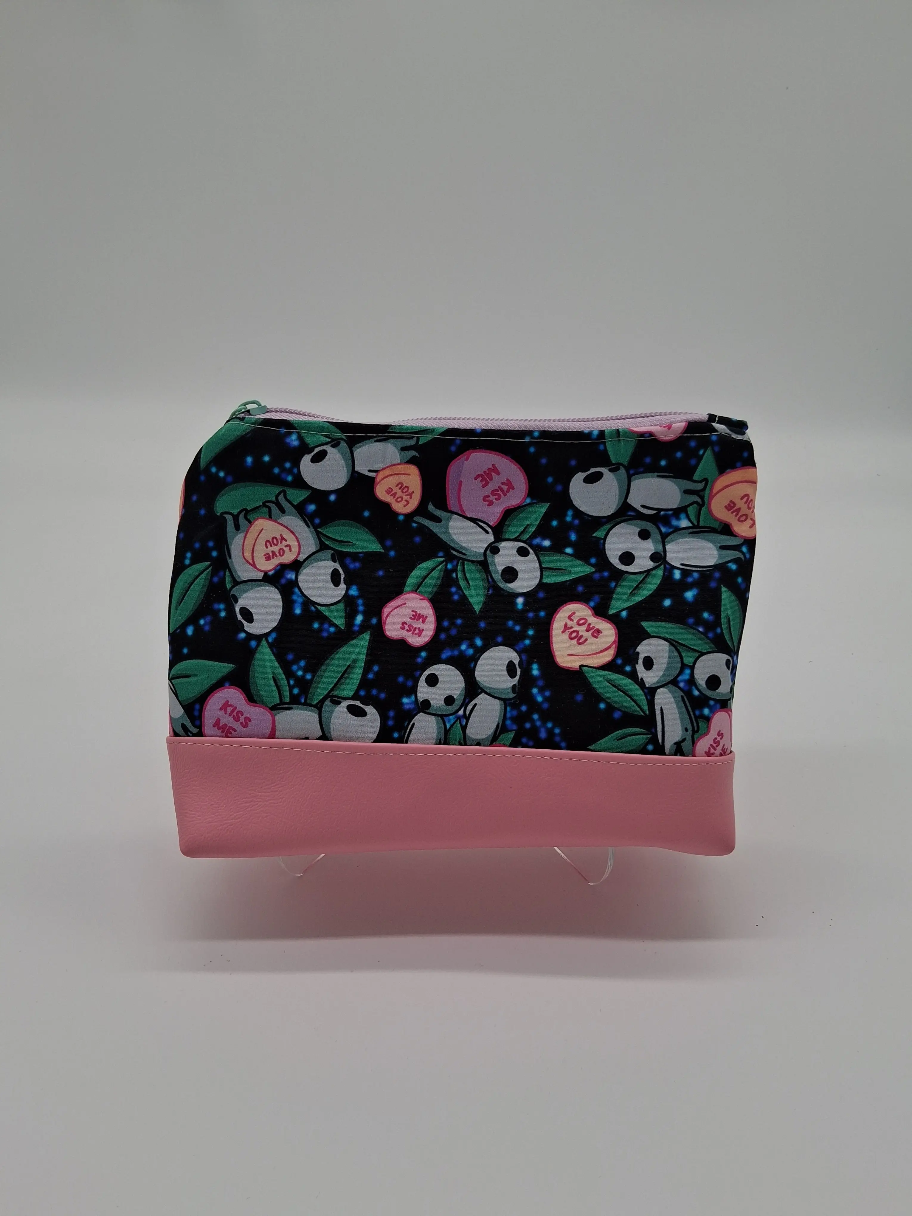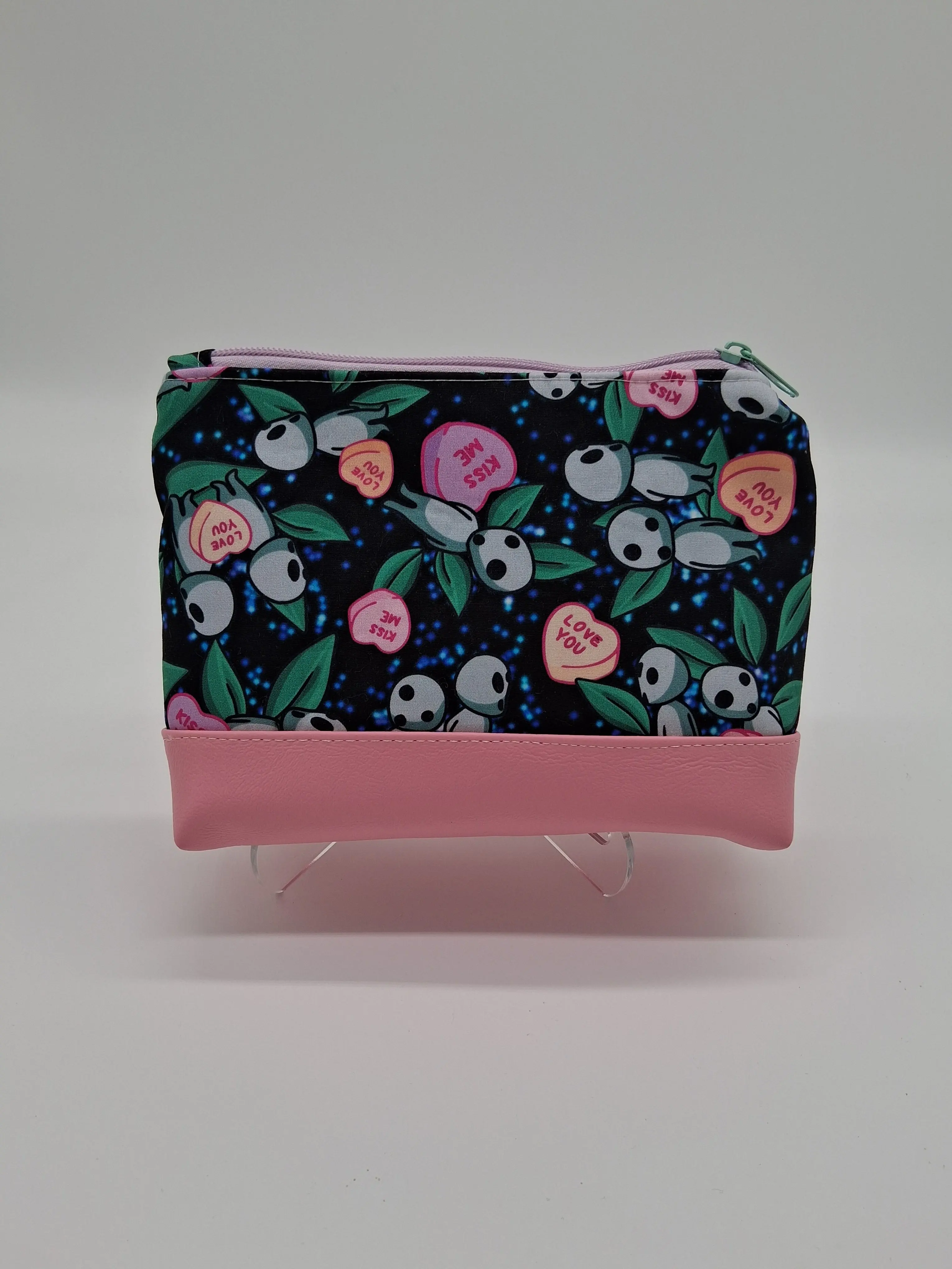 This cute little pouch has many different utilizations. The vinyl bottom gives structure to remain upright while the cotton offers enough flexibility to fit in a wide array of bags. Use it to keep your makeup safe, your office supplies together or your monthly moon supplies close by. A fitted zipper keeps it all securely inside.