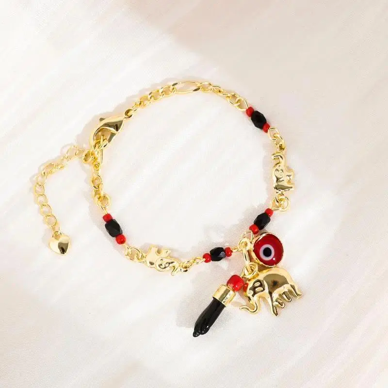 Elegant 14K Gold Plated Elephant Evil Eye Bracelet Material & Craftsmanship Made of brass with a 14K gold plating process, this bracelet is polished to a smooth, round finish. The gold plating ensures durability and a luxurious look. It's hypoallergenic, making it safe for all skin types. The adjustable size fits both adults and children comfortably. Size & Design Bracelet measures 7.5 inches and is adjustable for a perfect fit. It features an elephant charm and an evil eye charm with red and black beads. It means wisdom, wealth, longevity, protection, etc. The design blends bohemian style with cultural symbolism, making it a unique accessory. Care Instructions • Avoid contact with cosmetics. • Remove before exercising or swimming. • Store in a cool, dry place to prevent damage from chemicals. • Keep away from hard objects to avoid scratches. Quality Assurance Enjoy a 60-day worry-free return policy with 24-hour customer service. Maintain its shine by avoiding strong chemicals. This bracelet is a stylish, hypoallergenic piece that promises quality and care.