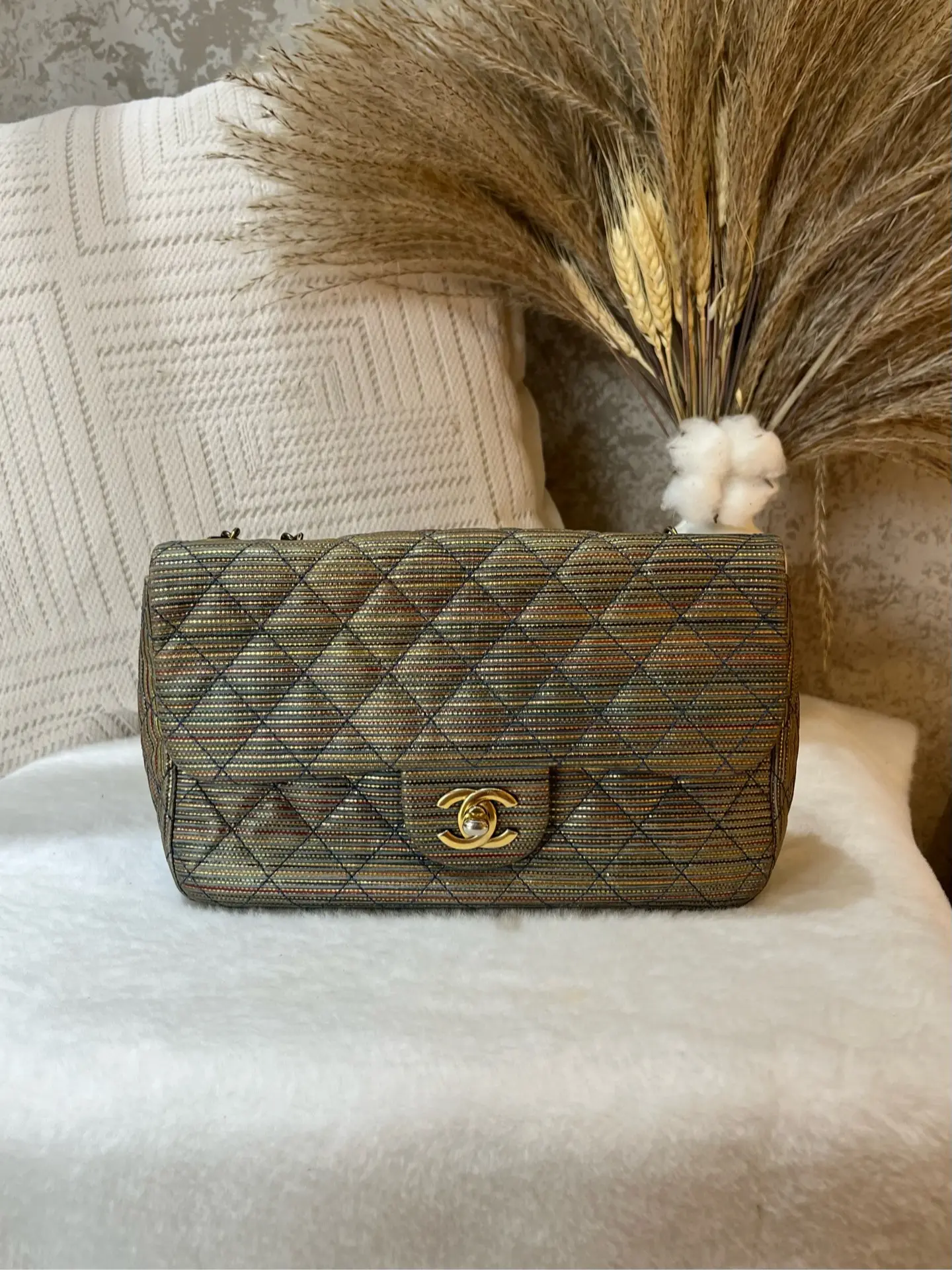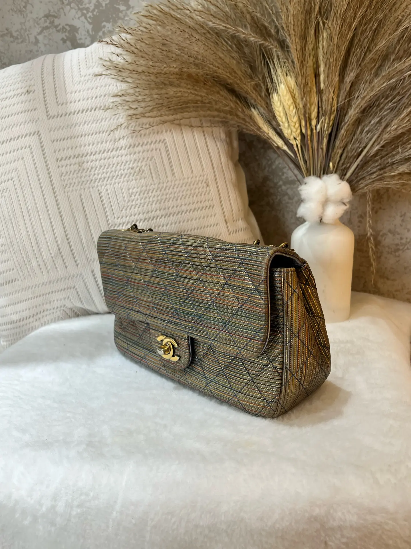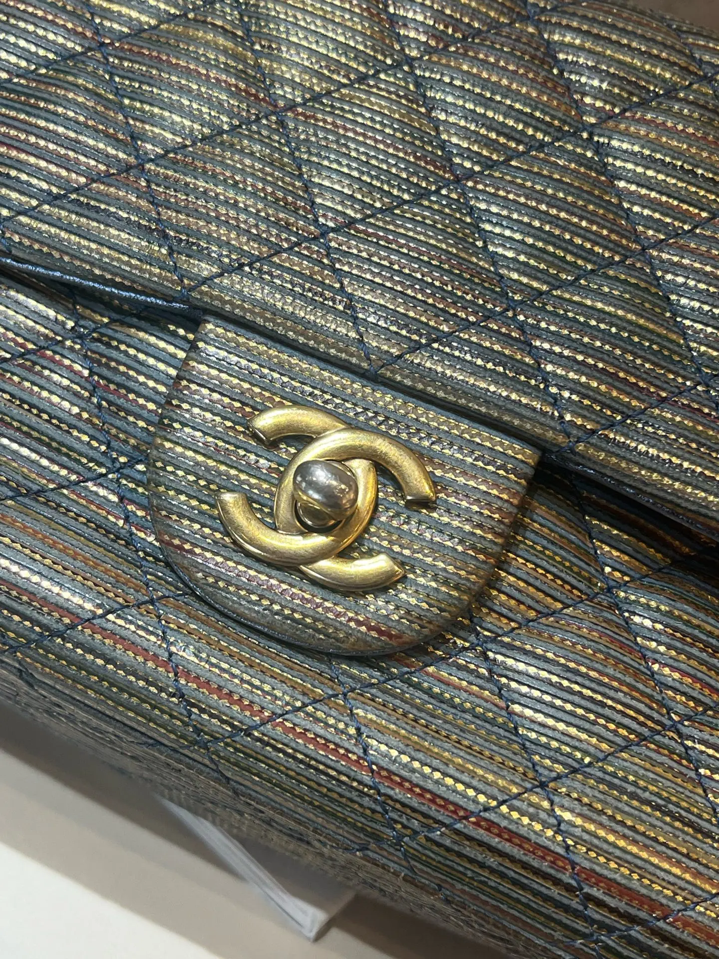 Authentic pre-owned Chanel Classic Flap Mini Square (Special Edition), 21-series with serial number intact. Features a stunning metallic striped quilted fabric, polished gold-tone CC turnlock, and iconic chain strap, a rare collector's piece in the coveted mini square size (12.5×9×13.5cm).