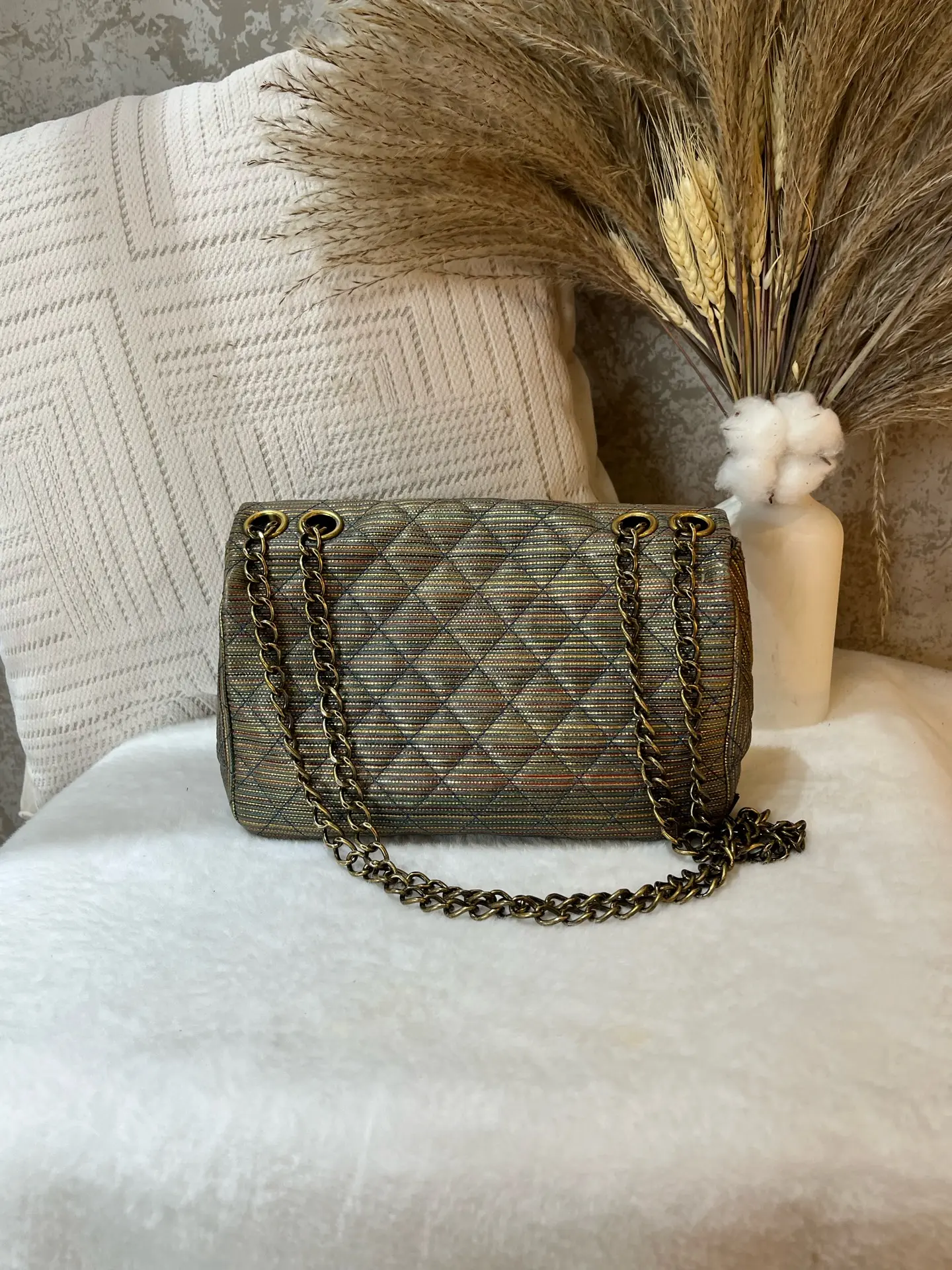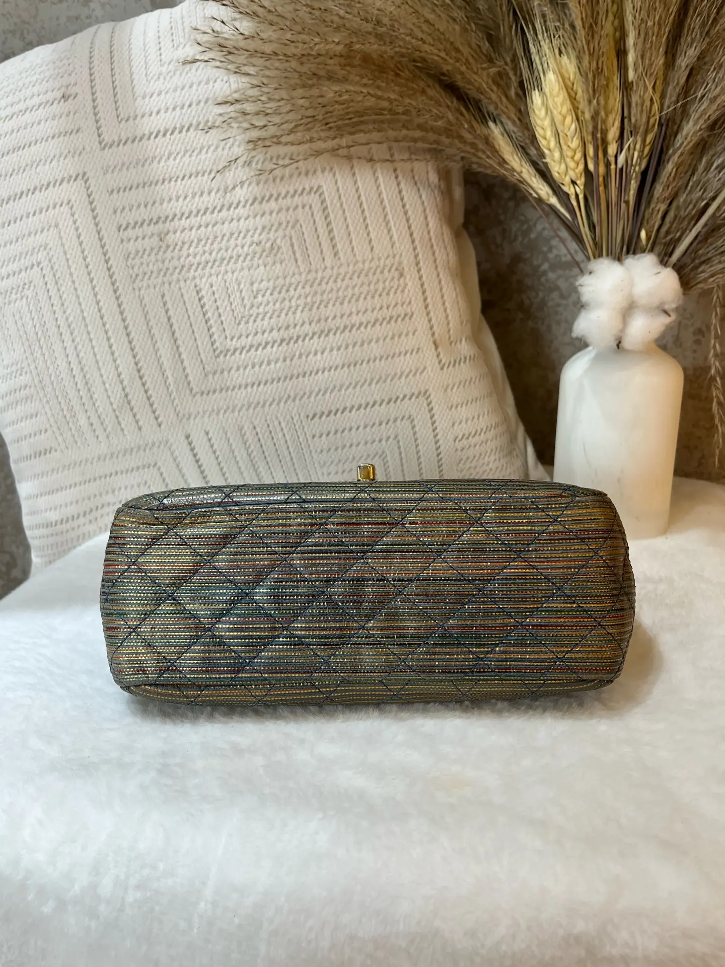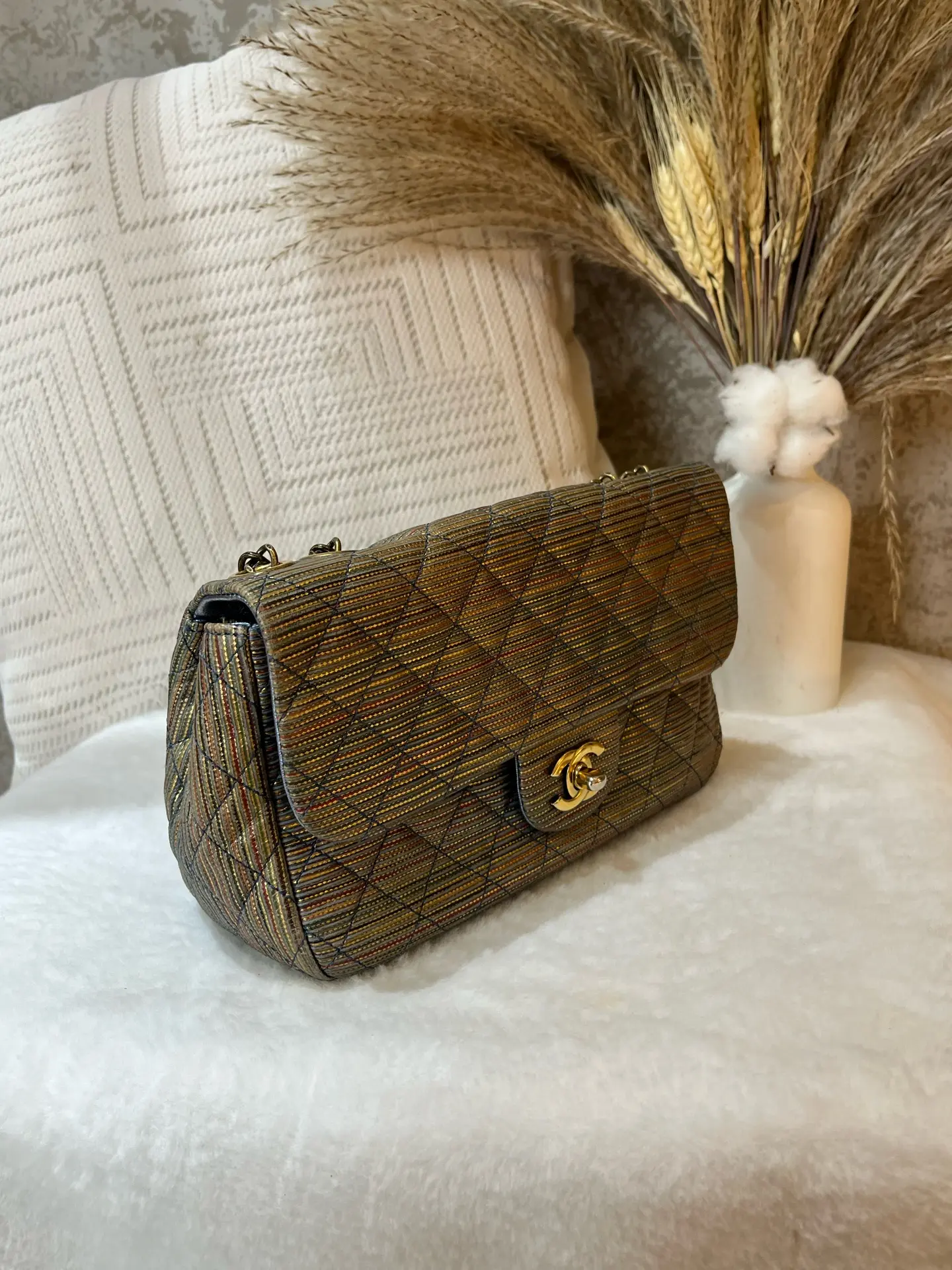Authentic pre-owned Chanel Classic Flap Mini Square (Special Edition), 21-series with serial number intact. Features a stunning metallic striped quilted fabric, polished gold-tone CC turnlock, and iconic chain strap, a rare collector's piece in the coveted mini square size (12.5×9×13.5cm).