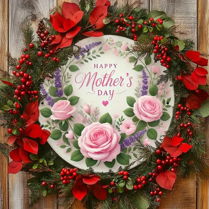 Happy Mother's Day Round Iron Wreath Sign, Vintage Floral Design with Pink Roses and Green Leaves, Easy To Hang for Indoor/outdoor Decoration - A Perfect