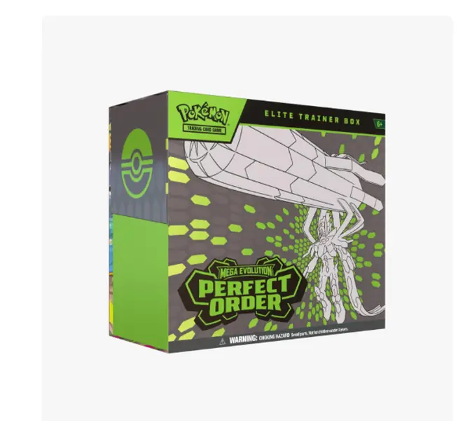 ·Card Text:Secret Powers Awaken!The pulse of the city beats in sync with the Pokémon and people who call it home—and preserving the order of it all is Mega Zygarde ex, the Legendary Pokémon who embodies strength in numbers! With threatening forces held at bay, peaceful days are ahead for the city's residents, including Pokémon like Mega Clefable ex, Mega Starmie ex, and Meowth ex, in the Pokémon TCG: Mega Evolution—Perfect Order expansion! The Pokémon Elite Trainer Box includes:• 9 Pokémon booster packs• 65 card sleeves• 45 Pokémon TCG Energy cards• A player's guide to the expansion• 6 damage-counter dice• 1 competition-legal coin-flip die• 2 plastic condition markers• A collector's box to hold everything, with 4 dividers to keep it organized• A code card for Pokémon Trading Card Game Live