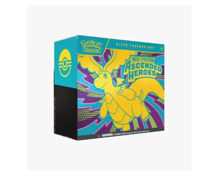 ·Card Text:Rise to a New Challenge!Marvel at the awesome potential as Mega Dragonite ex takes flight, leading a gathering of all-star Pokémon to battle! Trainer’s Pokémon and Stellar Tera Pokémon ex join returning and newly discovered Mega Evolution Pokémon ex, including some with special artwork showing off their biggest and boldest attacks. Celebrate the stars of Scarlet & Violet and the dawn of Mega Evolution with the Pokémon TCG: Mega Evolution—Ascended Heroes expansion!The Pokémon TCG: Ascended Heroes Elite Trainer Box includes:• 9 Pokémon TCG: Ascended Heroes booster packs• 1 full-art foil promo card• 65 card sleeves• 40 Pokémon TCG Energy cards• A player’s guide to the Ascended Heroes expansion• 6 damage-counter dice• 1 competition-legal coin-flip die• 1 plastic coin• A collector’s box to hold everything, with 6 dividers to keep it organized• A code card for Pokémon Trading Card Game Live