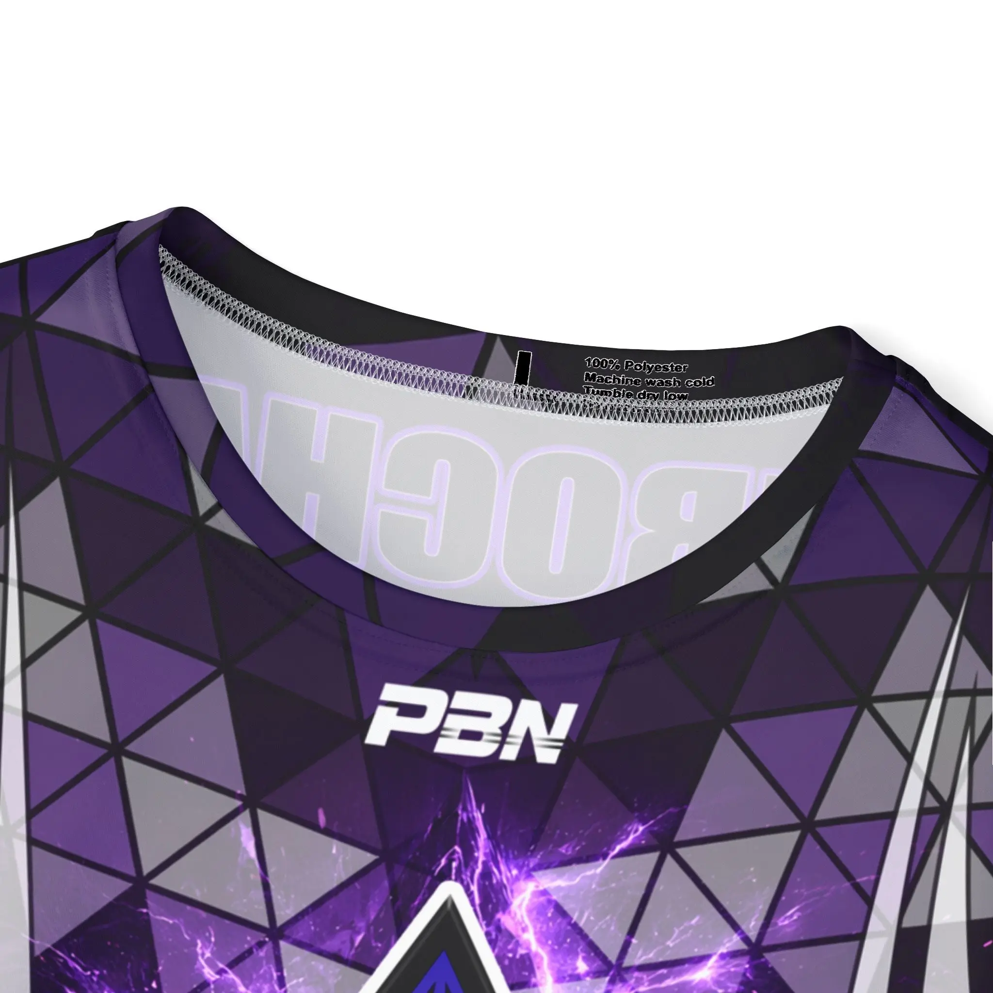 This all-over print sports jersey brings stadium energy into every match. Built from extra-light, moisture-wicking polyester, it moves with you and dries fast, so intensity never slows down. The slim-but-classic fit and 1x1 ribbed collar and armholes stretch on and snap back for a reliable, comfortable wear. Bold purple lightning, angular geometric panels, and a striking back number make it feel like your team’s identity — loud, focused, and ready to compete. Wear it for practice sessions, local tournaments, or when you want to rep your crew on game day.