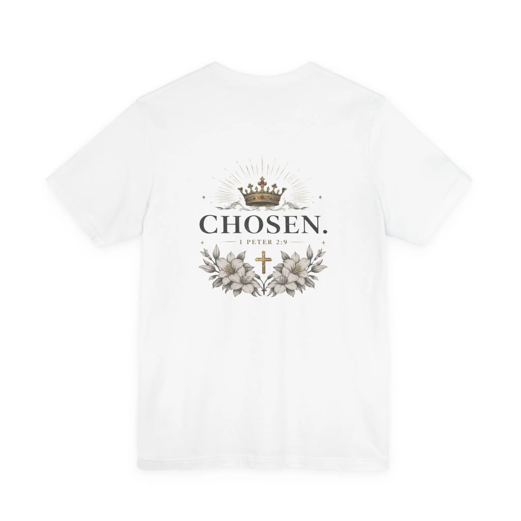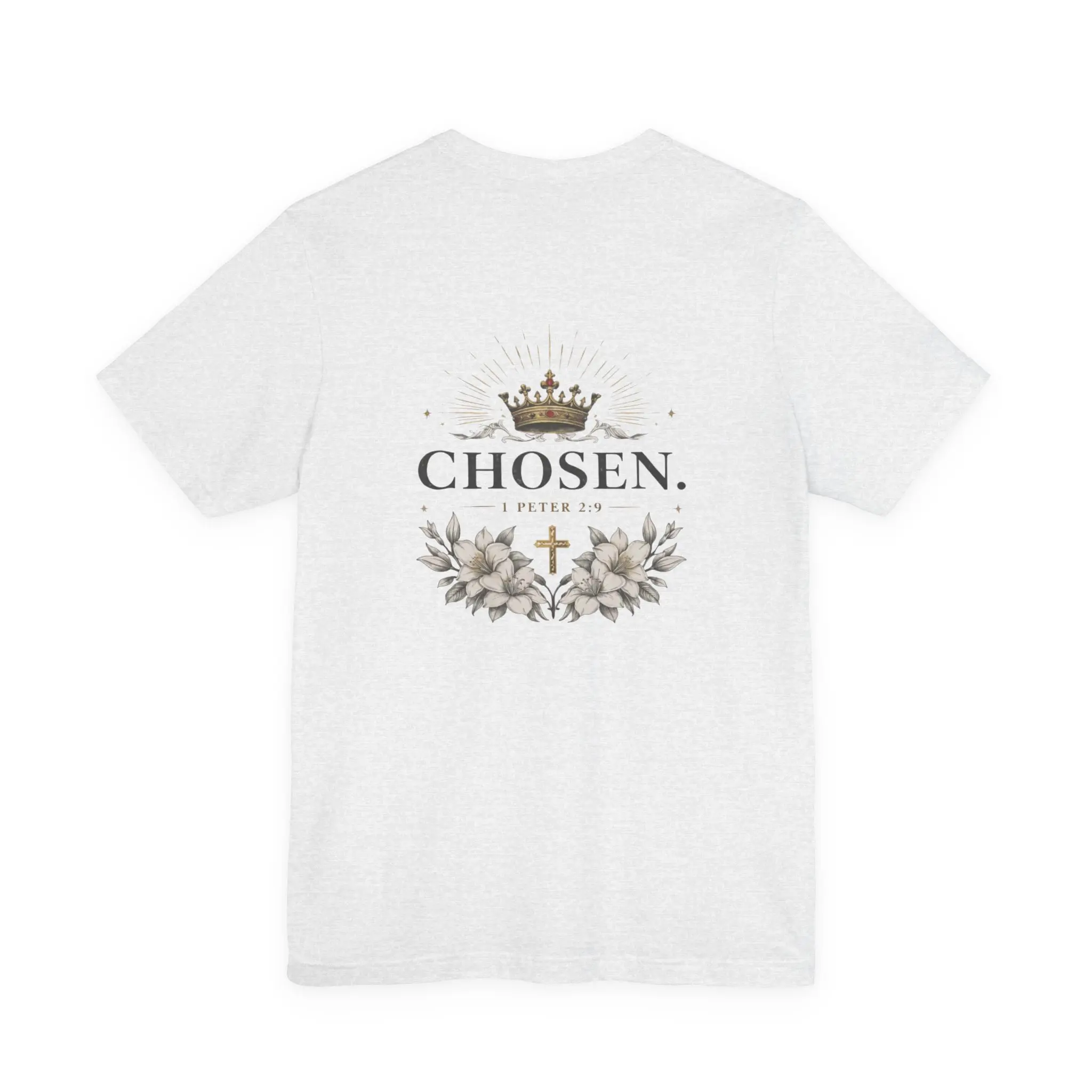 Soft, breathable, and thoughtfully detailed — this jersey tee carries a quiet, confident message. The front sports a subtle monogram over the heart while the back blooms with an elegant crest: a muted crown, delicate florals, and the word “CHOSEN.” framed with a small cross. It feels like a wearable reminder — calm, reverent, and refined — that layers easily under a jacket or stands alone during weekend gatherings. The lightweight Airlume cotton keeps you comfortable whether you’re running errands, heading to a small group, or pausing for a moment of reflection. Clean lines, a retail fit, and tear-away labeling make this shirt both comfortable and respectful of sensitive skin and everyday movement.