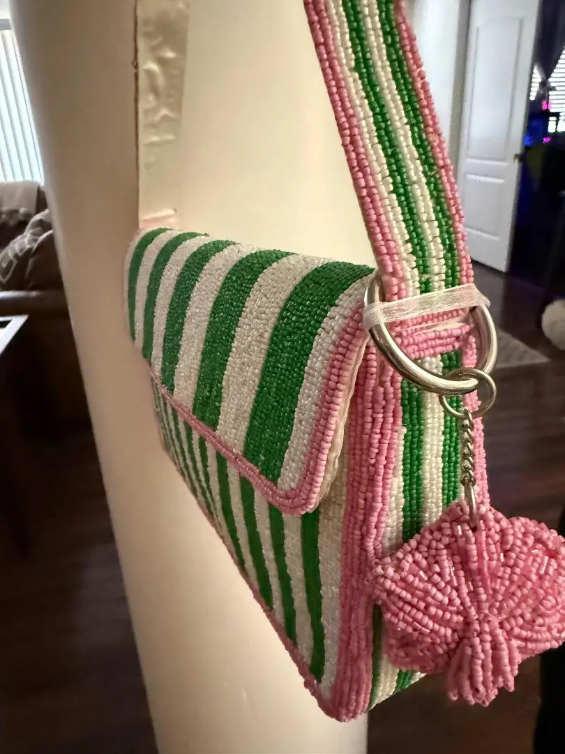 Such a fun, preppy statement piece 💕 This handmade beaded bag features vibrant pink and green stripes plus a matching charm for the cutest extra detail.
