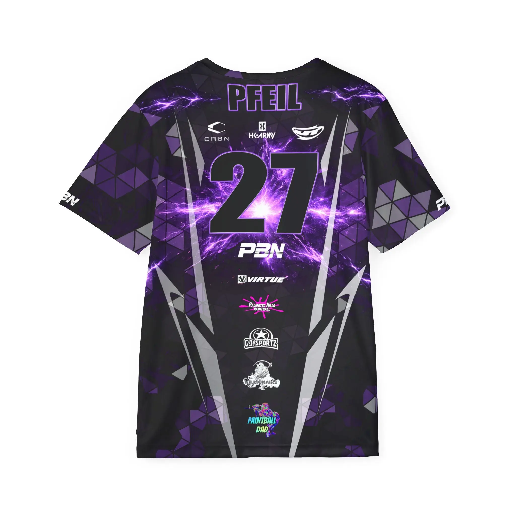 This all-over print sports jersey brings stadium energy into every match. Built from extra-light, moisture-wicking polyester, it moves with you and dries fast, so intensity never slows down. The slim-but-classic fit and 1x1 ribbed collar and armholes stretch on and snap back for a reliable, comfortable wear. Bold purple lightning, angular geometric panels, and a striking back number make it feel like your team’s identity — loud, focused, and ready to compete. Wear it for practice sessions, local tournaments, or when you want to rep your crew on game day.